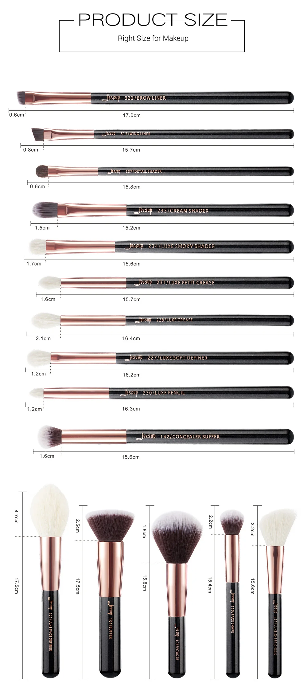 В комплект входит 15 шт. кистей для макияжа 101 Контуры лица: Длина кисти около: 17,5 см. Длина кончика около: 4,7 см. Тип ручки: Дерево Тип волос: натурально-синтетические волосы Контур и пудра 104 Буфер: Длина кисти около: 17,5 см. Длина кончика около: 2,5 см. Тип ручки: Дерево Тип волос: синтетические волосы Нанесение и смешивание основы, пудры и минеральной косметики 106 Пудра: Длина кисти около: 15,8 см. Длина кончика около: 4,8 см. Тип ручки: Дерево Тип волос: синтетические волосы Нанесение рассыпной и прессованной пудры 110 Контуры лица: Длина кисти около: 15,4 см. Длина кончика около: 2,2 см. Тип ручки: Дерево Тип волос: синтетические волосы Контур лица с помощью крема и пудры 127 Щеки: Длина кисти около: 15,6 см. Длина кончика около:3,2 см. Тип ручки: Дерево Тип волос: натурально-синтетические волосы Нанесение румян 142 Корректор: Длина кисти около: 15,6 см. Длина кончика около: 1,6см. Тип ручки: Дерево Тип волос: синтетические волосы Нанесение и смешивание консилера 227 Soft Definer: Длина кисти около: 16,2 см. Длина кончика около: 1,2 см. Тип ручки: Дерево Тип волос: натурально-синтетические волосы Мягко смешивает тени для век Сгиб 228: Длина кисти около: 16,4 см. Длина кончика около: 2,1 см. Тип ручки: Дерево Тип волос: натурально-синтетические волосы Смешивание и затенение для глаз 230 Карандаш: Длина кисти около: 16,3 см. Длина кончика около: 1,2 см. Тип ручки: Дерево Тип волос: натурально-синтетические волосы Точное затенение и сглаживание краев 231 Petit Crease: Длина кисти около: 15,7 см. Длина кончика около: 1,6см. Тип ручки: Дерево Тип волос: натурально-синтетические волосы Подчеркивая и смешивание 233 Кремовый шейдер: Длина кисти около: 15,2 см. Длина кончика около: 1,5 см. Тип ручки: Дерево Тип волос: синтетические волосы Применение крема для век 234 Дымчатый шейдер люкс: Длина кисти около: 15,6 см. Длина кончика около: 1,7 см. Тип ручки: Дерево Тип волос: натурально-синтетические волосы Затенение и смешивание с дымчатым эффектом 237 Детали шейдера: Длина кисти около: 15,8 см. Длина кончика около: 0,6 см. Тип ручки: Дерево Тип волос: синтетические волосы Нанесение теней для век 317 Лайнер: Длина кисти около: 15,7 см. Длина кончика около: 0,8 см. Тип ручки: Дерево Тип волос: синтетические волосы Тонкие штрихи подводки для глаз и идеальные контуры . 322 Линия бровей: Длина кисти около: 17 см. Длина кончика около: 0,6см. Тип ручки: Дерево Тип волос: синтетические волосы Кисточка для бровей для нанесения пудры и крема