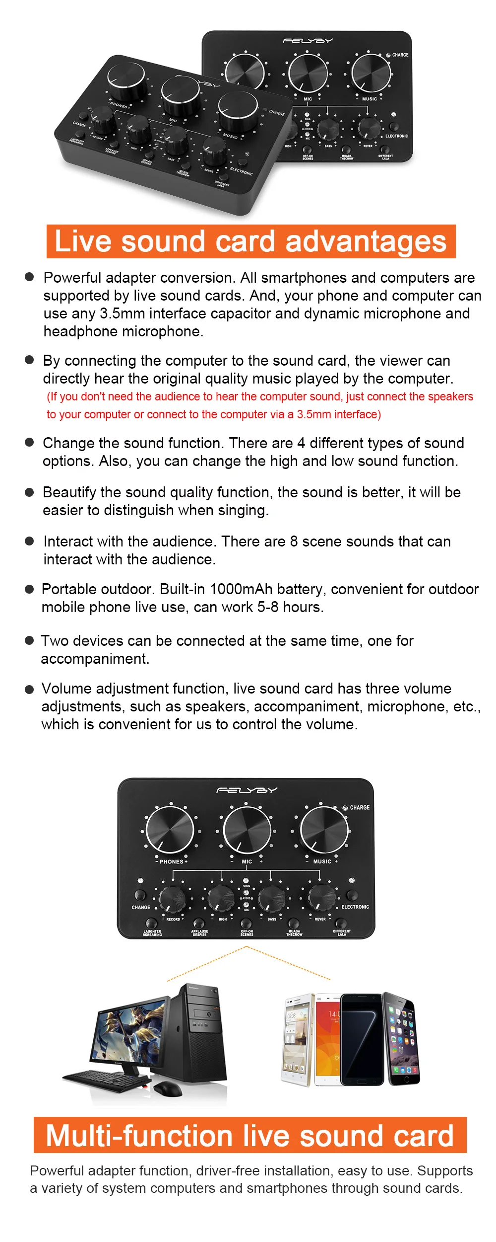 1. Специально разработанные компьютерные записи, пение сети 2.3D реверберация 3. Низкое выходное сопротивление для лучшего звука 4. Низкая частота может быть увеличена до 30 Гц, до 20 кГц 5. Профессиональное снижение уровня шума 6. Легко носить и использовать 7. Идеальная радиосвязь, голос, студия, домашняя запись, игры и видео чат 8. Пользовательская частотная характеристика составляет 30 Гц-20 кГц, обеспечивая четкий, высокоточный звук 9. Даже при сильном воздействии на установку, при изучении вибрации, используйте кнопку блокировки, чтобы установить angl