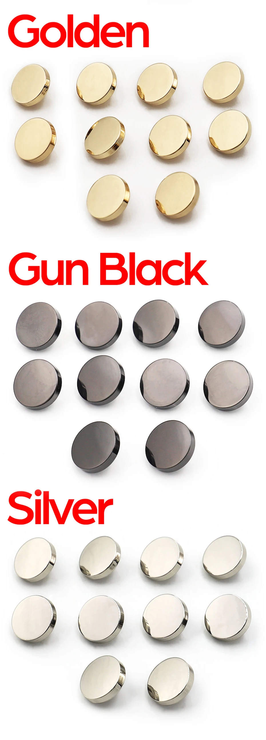 Материал: металл Размер: 10 мм, 12 мм, 15 мм, 18 мм, 20 мм, 23 мм, 25 мм 1 (мм) = 0,0394 (В) Форма: круглый Цвет: как показано на картинке Использование: Одежда, поделки своими руками Посылка: мешок Количество/Упаковка: 50 шт