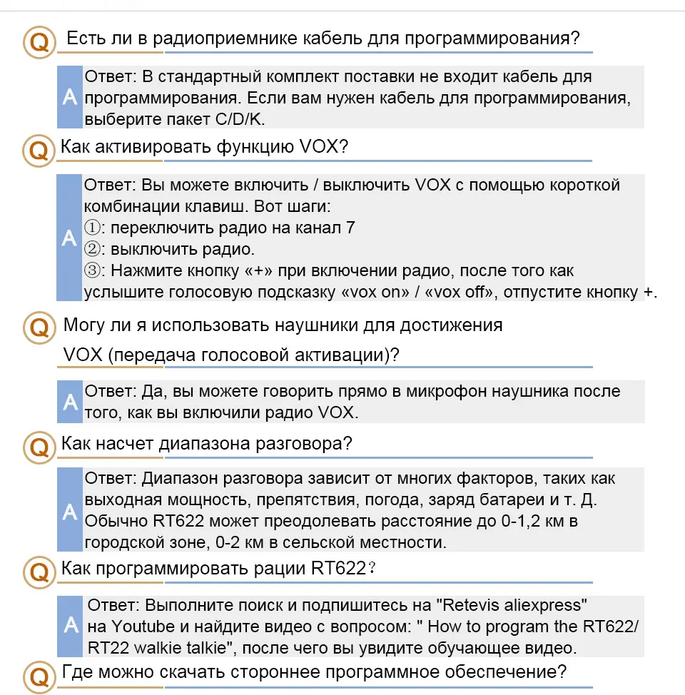 Retevis RT622 имеет функцию VOX, которая позволяет вам работать без помощи рук. Это особенно актуально для некоторых случаев использования громкой связи, таких как езда на велосипеде, удерживание предметов или работа.