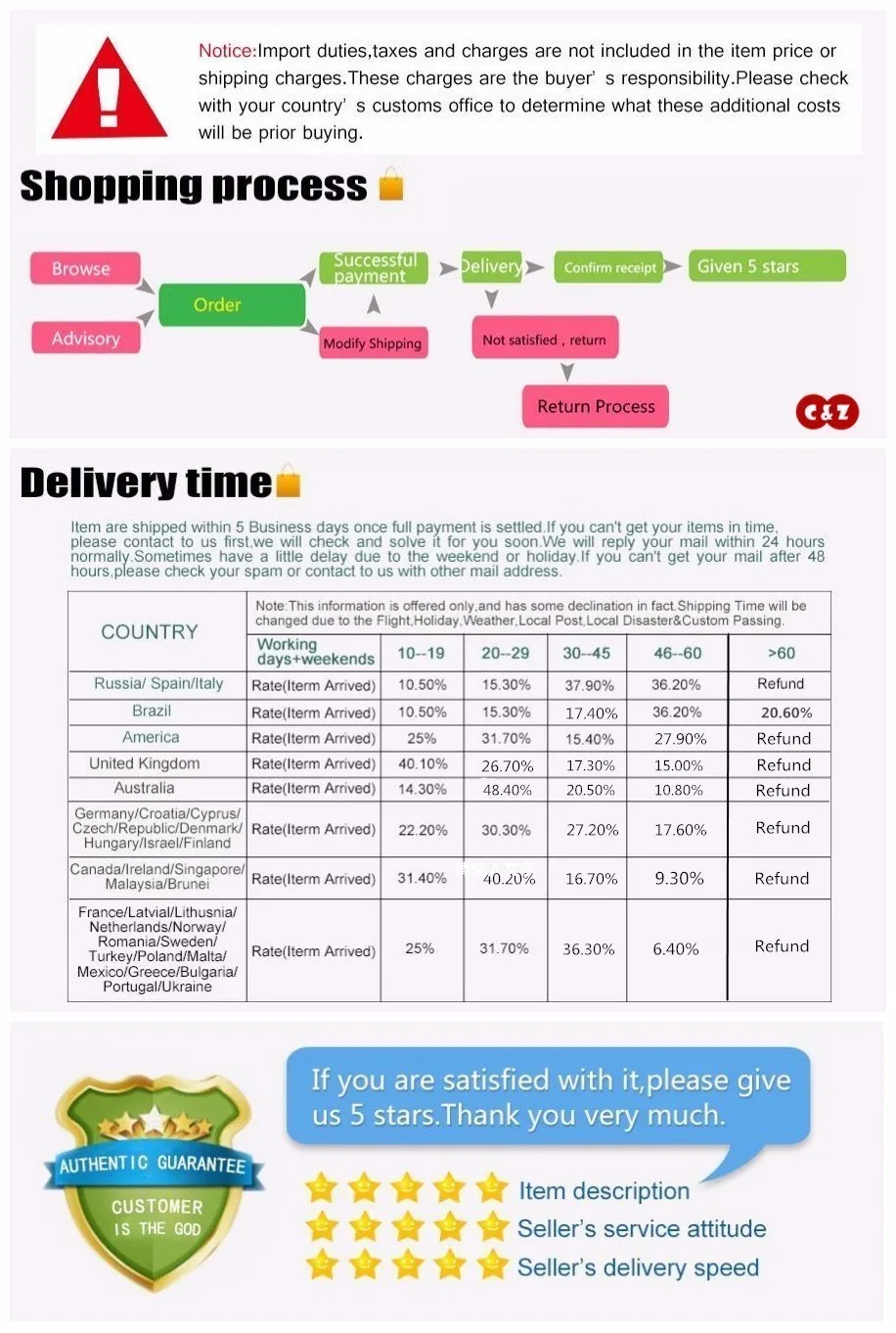 1. Время доставки может варьироваться в зависимости от праздничных дней, стран и таможенных процедур и т. д. Спасибо за понимание.2. Мы не несем ответственности за таможенную пошлину, возникшую в вашей стране,3. Все заказы будут отправлены в течение 3 рабочих дней.4.Доставка осуществляется через границу, а Авиапочта-это самый дешевый способ доставки, поэтому доставка займет длительное время (8-60 дней).Если вы хотите более быструю доставку, пожалуйста, выберите Экспресс-доставку, мы предлагаем EMS, DHL, Fedex, Ups, русский, ePackage, ramex и так далее.Отзывы:Удовлетворение ваших запросов и положительная обратная связь очень важны для нас. Пожалуйста, оставьте положительные отзывы и 5 звезд, если вы удовлетворены нашими товарами и услугами.Если вы остались недовольны качеством товара и обслуживания, не торопитесь подтверждать получение товара и писать негативный отзыв. Сначала свяжитесь с нами. Мы сделаем все возможное, чтобы решить любые проблемы и предоставить вам лучшее.