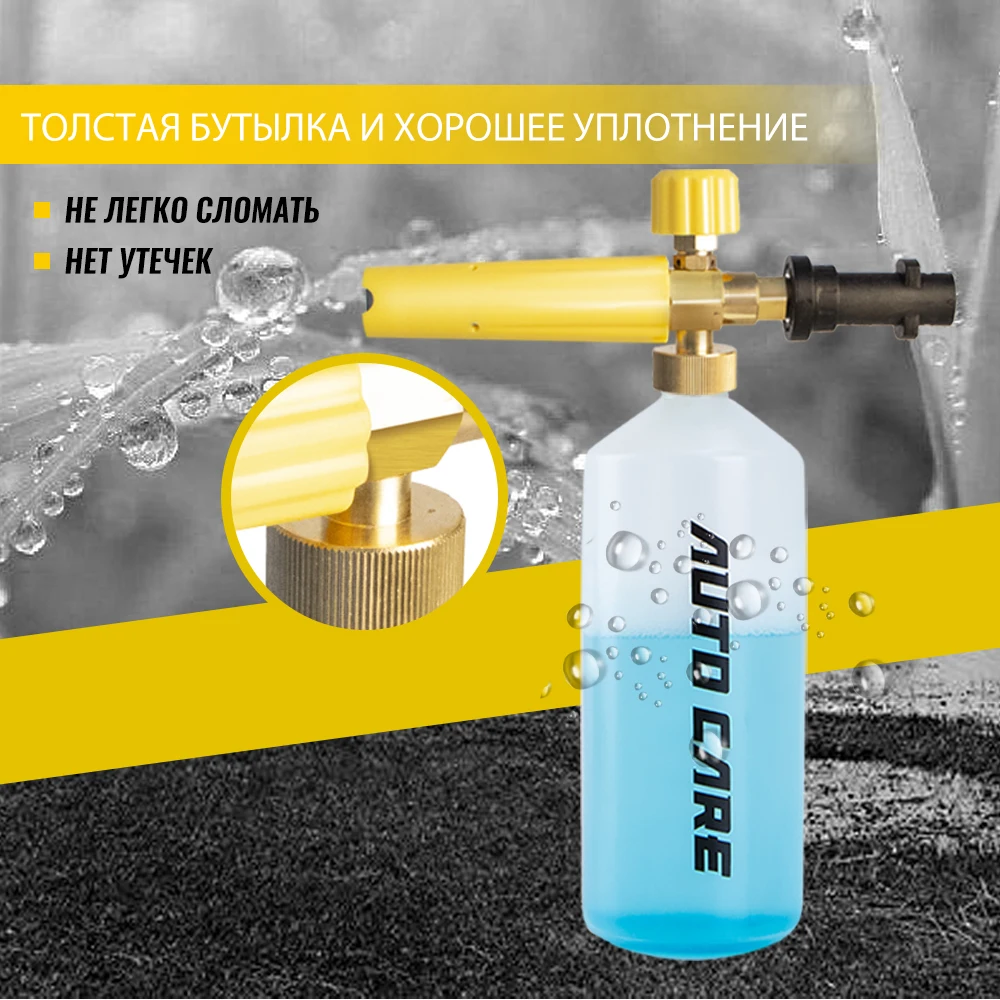 Поверхность бутылки имеет направляющую для измерения. Легко отрегулировать соотношение смешивания. Вы можете вращать форсунку, чтобы изменить форму распыления. Циферблат наверху для управления пенной смесью. Делает мягкую пушистую снежную пену, весело и просто. Работает с любыми мойками высокого давления, маленькие и большие - все работают идеально. Это экономит воду, это экологически чистая и бесконтактная мойка автомобилей, это экономит ваше время и энергию. Густая пена расплавляет стержни и загрязняет краску, тем самым уменьшая образование вихрей и царапин.