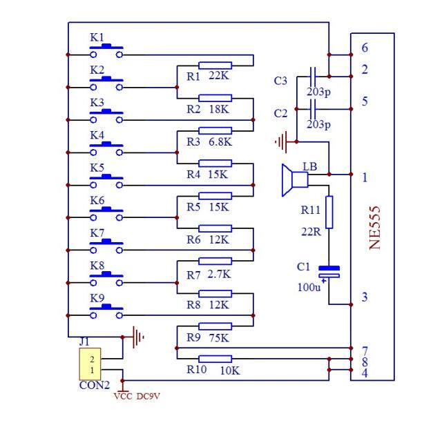 Заявление рот: Схема цепи может производить различные звуки, но не ключи, соответствующие разным чешуям, электронный орган Играл с пальчиками по разным ключам, в результате чего в разных весах, principle-circuit ic555-связной Как звук часто семидурнальный осциллятор, частота колебаний сопротивления (r1-r10) сопротивление, поэтому разные Ключи имеют разные голоса. Этот канал имеет достоинства есть: Простое, практическое, низкое энергопотребление, и канал-это использование интегрированных драйверов цепи, меньше частей, линия Прост понять. Принцип работы цепи: Сопротивление r1-r9 является выбором частоты колебаний, и они состоят из 9 различных колебаний Частоты, сопротивление R10, емкость C1 и ic555. Частота избирательного сигнала контролируется k1- K9 Micro кнопка, А выход от ic555 Audio сделает громкий звук в громкоговорителе громкоговорителя. Когда модель утилиты функционирует, электронный орган может вырабатывать постоянный громкий звук, нажав на ключ. Если пресс Кнопки нажимаются в свою очередь, на красивую музыку можно играть. Доставка список: