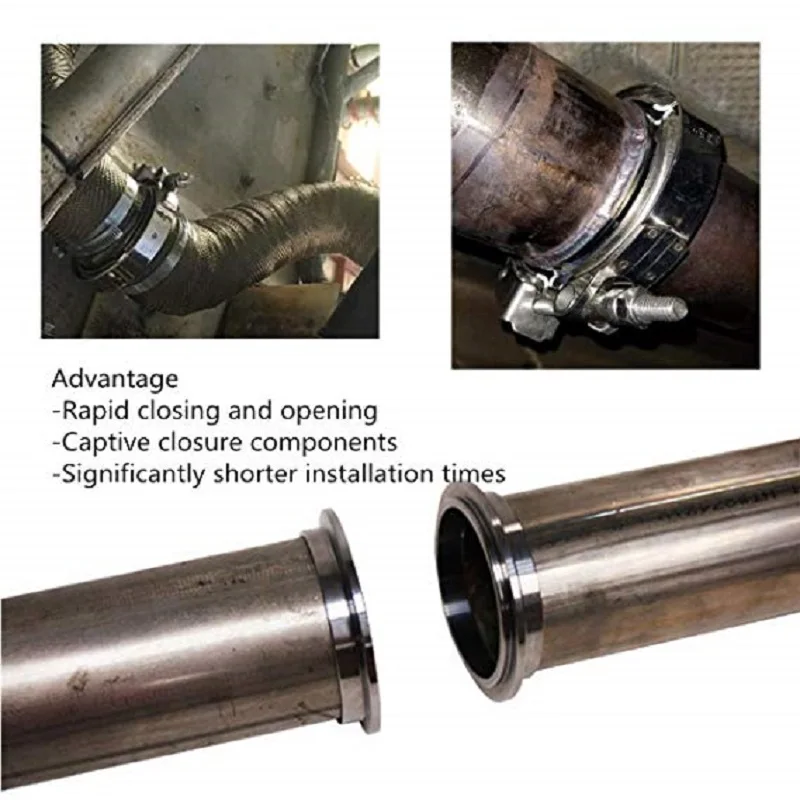 V-образные зажимы и фланец позволяют легко устанавливается и удалять выхлопные системы и турбо-детали, такие как трубы, трубы B и т. Д. Эти хомуты отлично подходят для гонщиков и тюнеров, поэтому легко удалять детали, получая доступ к базовым componenets, так как не трудно достигать болтов или специальных инструментов. Просто отстегните зажим, и вы можете легко удалить деталь