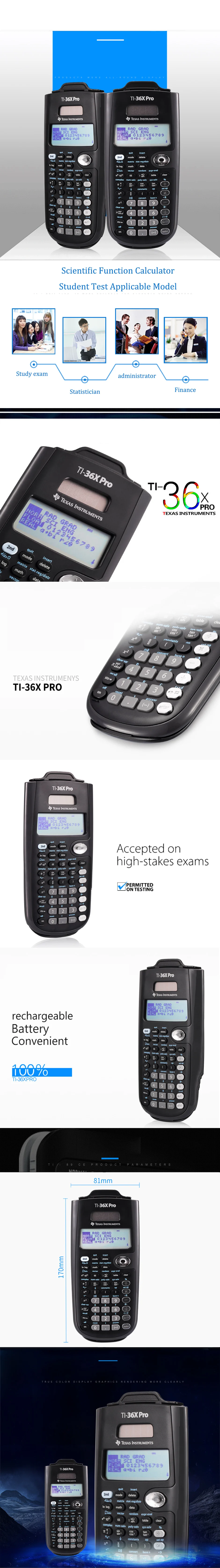 Бренд: Texas Instruments Модель: TI-36X PRO Тип продукта: калькулятор с научными функциями Параметры продукта: 170x81x11mm Язык конфигурации: английский дисплей и выход Оснащен источником питания: солнечная батарея с двумя CR-2032 * 1 Материал кнопки: жесткие пластиковые цветные кнопки Материал экрана: светодиодный HD экран Отображение цифр: 4 линии X 16 цифр Применимые люди: младшие старшеклассники/Студенты колледжа/профессиональные выпускные экзамены и зарубежные студенты Применимый экзамены: студенческий учебный экзамены Подробные сведения о функции ●Introduction для основных функций TI-36X Pro-это новый и более продвинутый научный калькулятор, оснащенный высококачественным многовиновым дисплеем, и имеет функцию MATHPRINT для естественного отображения математических символов, формул и баллов. Мощные Математические Функции идеально подходят для инженерных, математических, научных, бизнес-студентов, инженеров и профессионалов. Подходит для: инженерных работ, вычислений, компьютерных исследований, статистики, тригонометрии, геометрии, алгебры, бизнеса ● Многоканальный дисплей Просматривайте несколько вычислений одновременно, сравнивайте результаты и функции исследования на экране. Дисплей MULTIVIEW может отображать до четырех линий. Omathprint функция Просмотр математических выражений, символов и твердых баллов, как показано в учебнике, без дополнительных корректировок и быстрый доступ к часто используемым функциям. ●Scroll и редактировать Например, загрузка образцов на функциональный калькулятор, удобно вводить данные, прокручивать записи вычислений, редактировать и изучать функции. ●Switch ключ Быстро просматривайте дроби, десятичные дроби и термины (включая n) поочередно, изучая более современные темы. ●Mode меню Структура меню проста, интуитивно понятна и проста в эксплуатации. Выберите угол/радиан, плавучую точку/фиксированную точку, Классический/MATHPRINT или формат чисел ●Memory переменных Семь доступных переменных памяти можно использовать для хранения реальных чисел и реальных чисел результатов выражений, ●Data стол редактор Вы можете вводить статистическую информацию в трех таблицах с объемом до 42 единиц в каждой таблице. Любая введенная формула списка может выполнять все функции калькулятора. Выполните однородный и бинарный переменный анализ и Отобразите шесть различных моделей рецессии. ●Solver Доступны три решения: Цифровые уравнения, полиномы и линейные системы уравнений. ●Function стол Отображение определенных функций в табличной форме ●Derivative и интеграл Определите цифровую производную и интегральную реальную функцию (Вектор и матрица Используйте окно ввода вектора и матрицы для выполнения векторных и матричных операций. Эта функция аналогична матричной функции калькулятора T1-84 PLUS graphing. ●Constant и преобразования Девять констант доступны для выбора, и эти константы могут быть вставлены в различные окна. Простое в использовании меню может конвертировать 18 метрических/имперских единиц, . Не программируемый