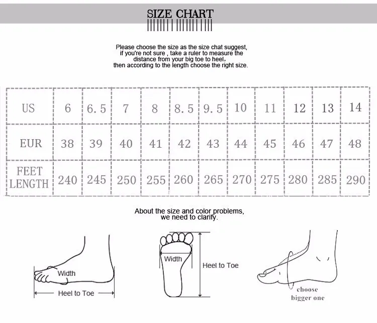 Спасибо за выбор этого товара! Все модные товары в нашем магазине: О размерах и цветовых проблемах, мы должны уточнить: 1. Различные мониторы могут отображать разные цвета, даже если они одного цвета, Поэтому, пожалуйста, учитывайте разумную разницу в цвете. 2. Пожалуйста, выберите размер в соответствии с таблицей размеров. Если вы не уверены, Возьмите линейку, чтобы измерить расстояние от большого пальца до пятки, Затем выберите правильный размер в соответствии с длиной стопы.