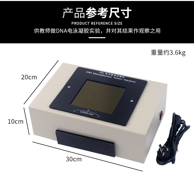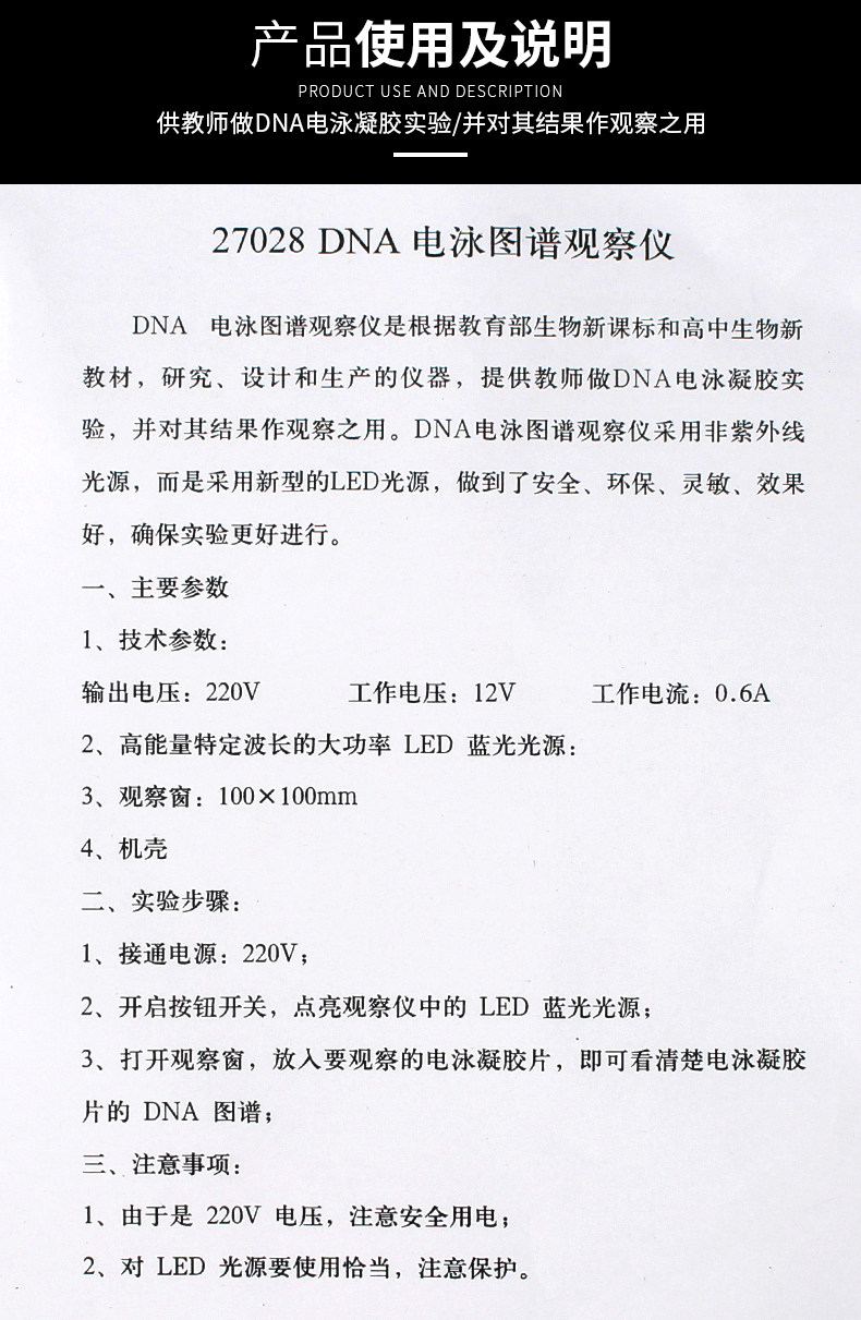 Наблюдатель спектрограммы электрофореза является инструментом для исследований, проектирования и производства на основе новых стандартов обучения биологии Министерства образования и новых учебников биологии для средней школы. Он предоставляет учителям эксперименты с гелем электрофореза и наблюдает за результатами. В настоящее время в спектрометре с электрофорезом на основе DNA используется неультрафиолетовый светильник, но новый тип светодиодный светильник-источник, который является безопасным, экологически чистым, чувствительным и эффективным, обеспечивая лучшие эксперименты.Основные параметры1. Технические параметры:Выходное напряжение: 220 ВРабочее напряжение: 12 ВРабочий ток: 0.6A2. Высокая мощность светодиодный синий светильник источник света с высокой энергией и определенная длина волны3. Смотровое окно: 100 × 100 мм4. ШассиЭкспериментальные шаги:1. Подключите источник питания: 220 В;2. Включите кнопочный переключатель, чтобы светильник включал синий светодиодный светильник в наблюдателе;3. Откройте окно наблюдения и поместите гелевый лист электрофореза, который будет наблюдаться, затем образец образца для электрофореза геля может быть четко виден;Меры предосторожности:1. Поскольку напряжение составляет 220 В, обратите внимание на безопасное использование электроэнергии;2. Используйте светодиодный светильник должным образом и обратите внимание на защиту.