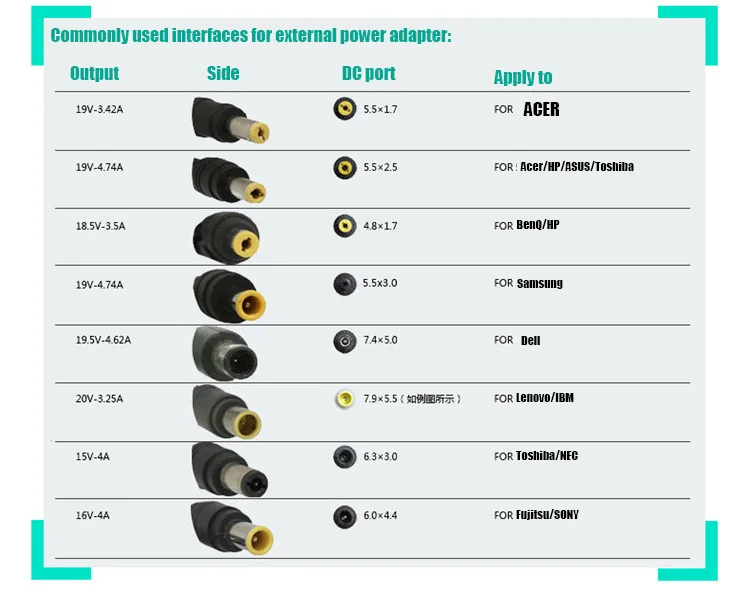 M2 | 19,5 в (90 Вт макс.) | Φ4.5*3,0 мм | Для струйного принтера HP / Compaq | 19,5 V 3.33A, 19,5 V 4.62A и т. Д. |