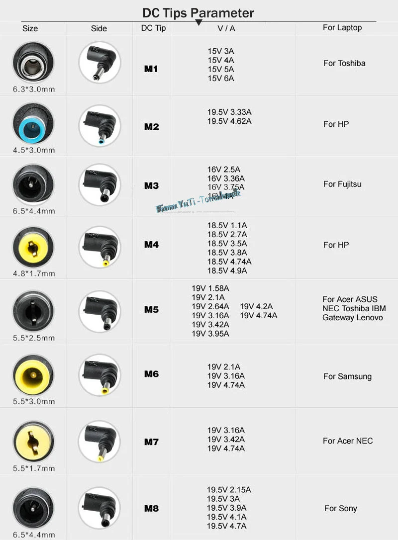 M1 | 15 в (90 Вт макс.) | Φ6.3*3,0 мм | Для TOSHIBA | 15V 3A , 15V 4A , 15V 5A , 15V 6A; |