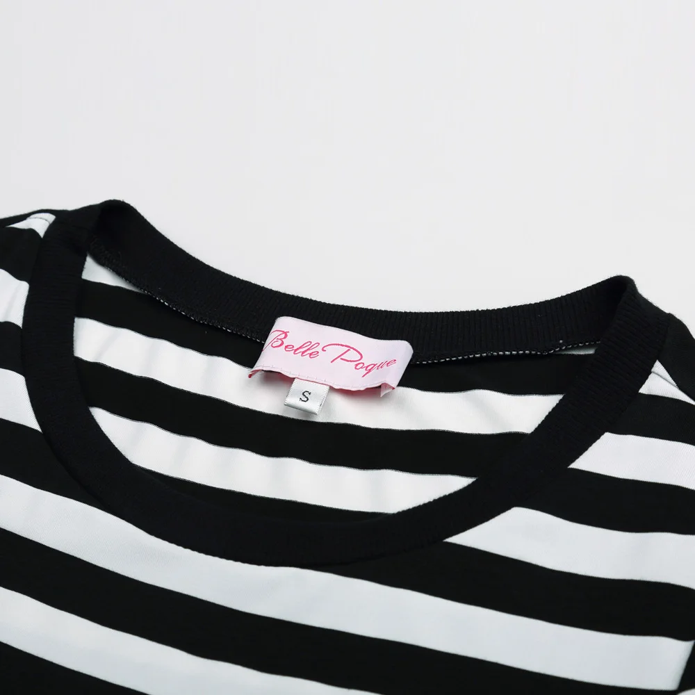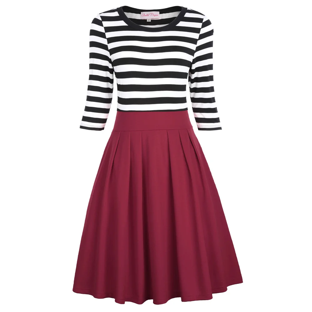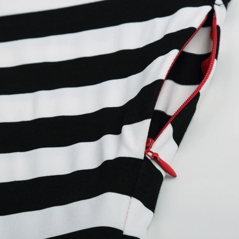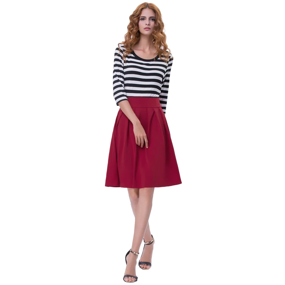 1) рукава длиной три четверти 2) вырез лодочкой 3) дизайн в морском стиле, узор в полоску 4) скрытая молния с левой стороны 5) верхняя часть хорошо эластичная, юбка немного эластичная 6) без подкладки |