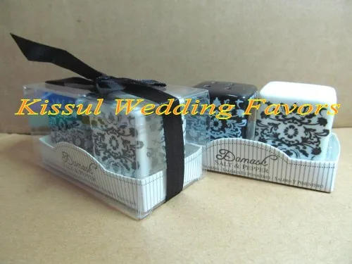 Описание:(20 шт./лот = 10 коробок) свадебное украшение свадебный душ Дамасская соль и перечница Свадебные сувениры для черно-белых подарков