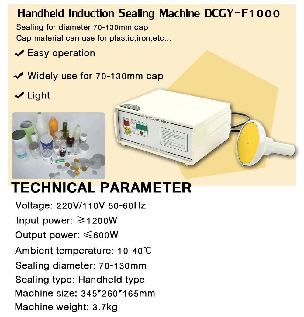 Эта машина использует электромагнитную индукционную печатающую пленку для производства мгновенного высокого тепла для расплавления алюминиевой фольги, которая затем прилипает к кромколу, учит цель защиты от влаги, утечки, защита от плесени и увеличение срока хранения. Источник питания: AC220V 110 V 50 ~ 80 HZ Входная мощность: мин. 1200Вт Выходная мощность: Макс. 600 Вт Влажность окружающей среды: до 90% PH без конденсации Температура окружающей среды: 10-400 градусов по Цельсию Диаметр уплотнения: 70-130 мм Тип уплотнения: Тип ручки Размер: 260*345*165 мм Степень защиты: IP20 Стандарты безопасности: GB15579.1995