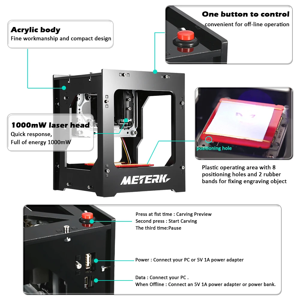 Этот мини-станок для лазерной гравировки, который имеет функцию резьбы по принту, отличается высокой точностью и высокой стабильностью, отлично подходит для гравировки DIY. Поддерживает автономную работу. Он также оснащен лазерной головки.