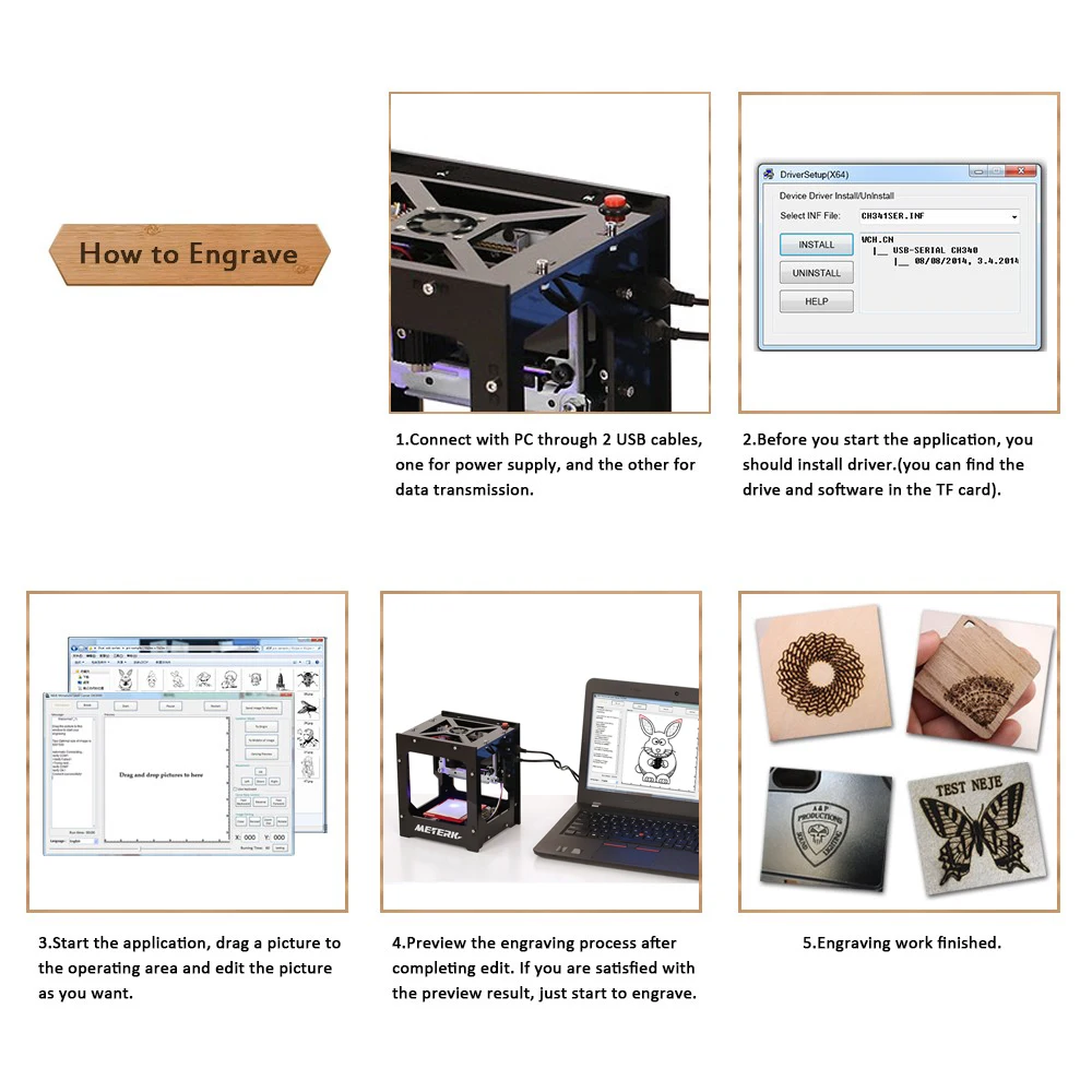 Может использоваться для гравировки бамбука, кожи, резки бумаги, печатных плат или других легковоспламеняющихся материалов.
