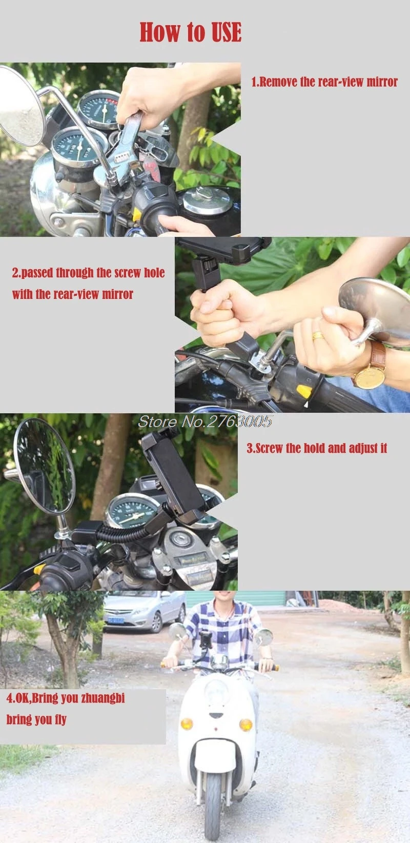 Подходит для мотоцикла или велосипеда Диаметр руля: 22 мм-38 мм Держатель телефона для мотоцикла, электрического транспортного средстваОписание продукта: Характеристики продукта: 1 Этот продукт напрямую установленный на мотоцикле, электрическое зеркало заднего вида, безопасное и безопасное. 2 использование aШирокий диапазон, от ограничения диаметра руля, до тех пор, пока зеркало заднего вида, можно установить. 3 удерживает большой диапазон, регулируемыйШирина 5-12 см, для всех мобильных телефонов. 4 Конструкция шланга, регулировка угла.