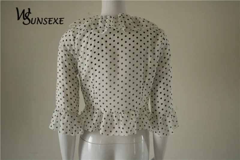 Wsunsexe 2017 Лето Женская рубашка в горошек короткий стиль повседневные оборки на пол расклешенные рукава принт блузки V-образный вырез пляжный кроп Топ