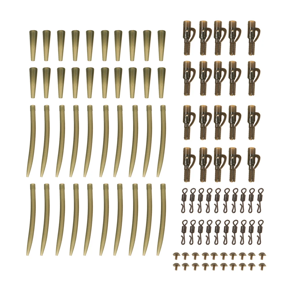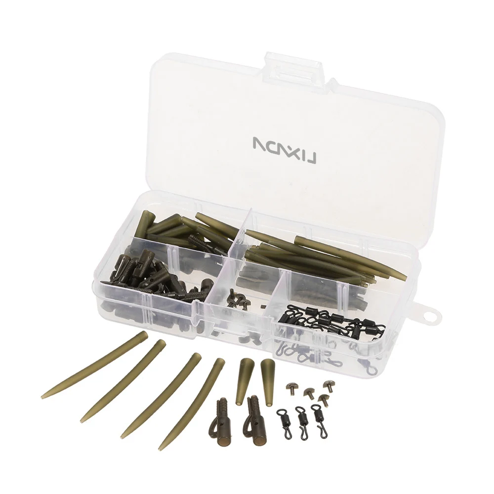 Всего 100 штук рыболовных принадлежностей, включает 20 свинцовых зажимов, 20 хвостовых резиновых трубок, 20 вертлюгов, 20 резиновых втулок и 20 штифтов.