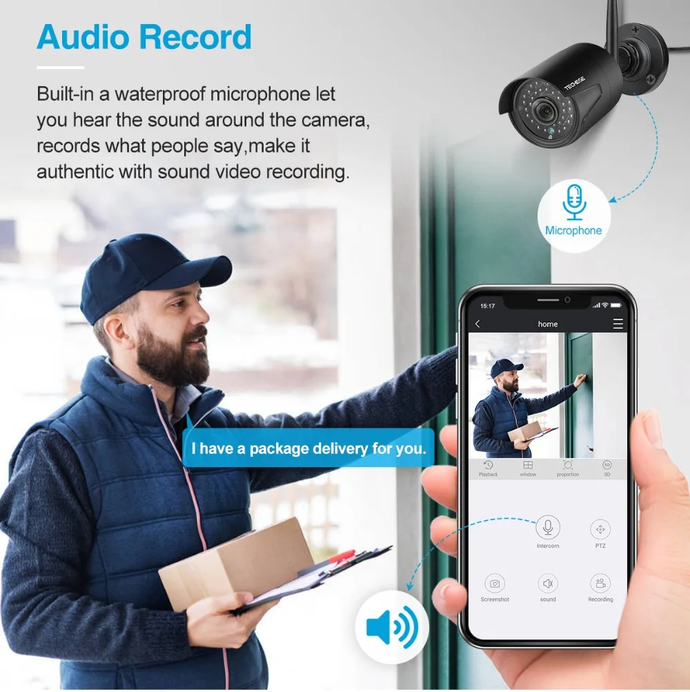 Wi-Fi камера поддерживает аудио. Каждая камера позволяет добавить микрофон без дополнительного кабеля питания; NVR выводит голос через аудио порт HDMI. Конечно, вы также можете услышать из приложения.