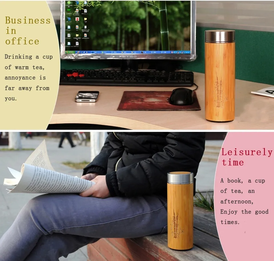Бамбуковый дорожный термос 400 мл, бутылки из нержавеющей стали для воды, вакуумные фляжки, изолированные термосы для чая, кофе, чашки бардака по индивидуальному заказу Демонстрация покупателя