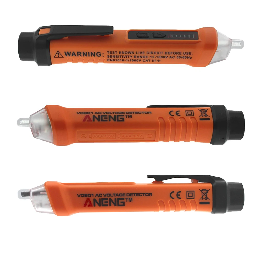 ANENG VD801 высокого качества Бесконтактный тест-карандаш 12-1000V детекторы напряжения переменного тока: есть Автоматическое Отключение Электрический тест карандаш ANENG VD801 Тесты карандаш Описание продукта: -Профессиональный AC Напряжение детектор с Бесконтактный тест. -Чувствительность напряжения от 12 В до 1000 В переменного тока. -Чувствительность напряжения переменного тока регулируется -Инструкции по звуку и светильник. -Автоматическое выключение. -Безопасный, профессиональный и простой в использовании. -Маленькая и компактная ручка, дизайн для удобной переноски. Особенности: 1. Протяните застежку-тип Батарея крышка, легко плавкого Батарея. 2. Автоматически Выделите нулевой линии и сигнальной линии. 3. Звук и светодиодный сигнал тревоги 4. Автоматический выбор 3 Виды чувствительности. (Высокий, средний, низкий) Технические характеристики: Напряжение Чувствительность: 12V постоянного тока до 1000 В переменного тока Частота: 50-60 Гц Режим сигнализации: звук и светильник Вспышка светильник: белый Автоматическое выключение питания: Да Операционной Температура: от 32 до 122F (от 0 до 50 градусов) Для хранения Температура: от-4 до 140F (от-20 до 60 градусов) Влажность: < 85% относительной влажности Батарея: 2*1,5 V AAA батареи(Батарея в комплект не входит)