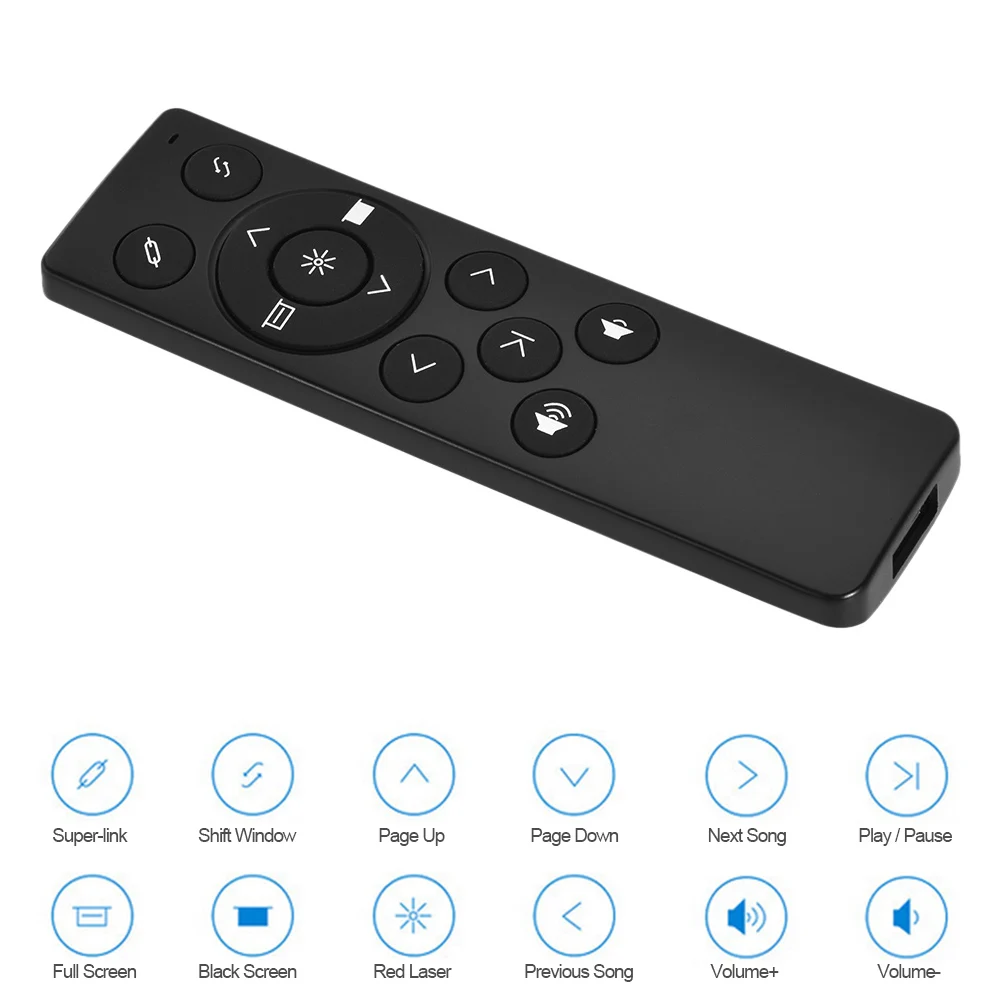 Одна кнопка, одна функция, поддерживает страницу вверх и вниз, перемещая курсор вверх и вниз, гиперссылка, переключение окна, полный экран, черный экран, воспроизведение/пауза, регулятор громкости и красный лазер.