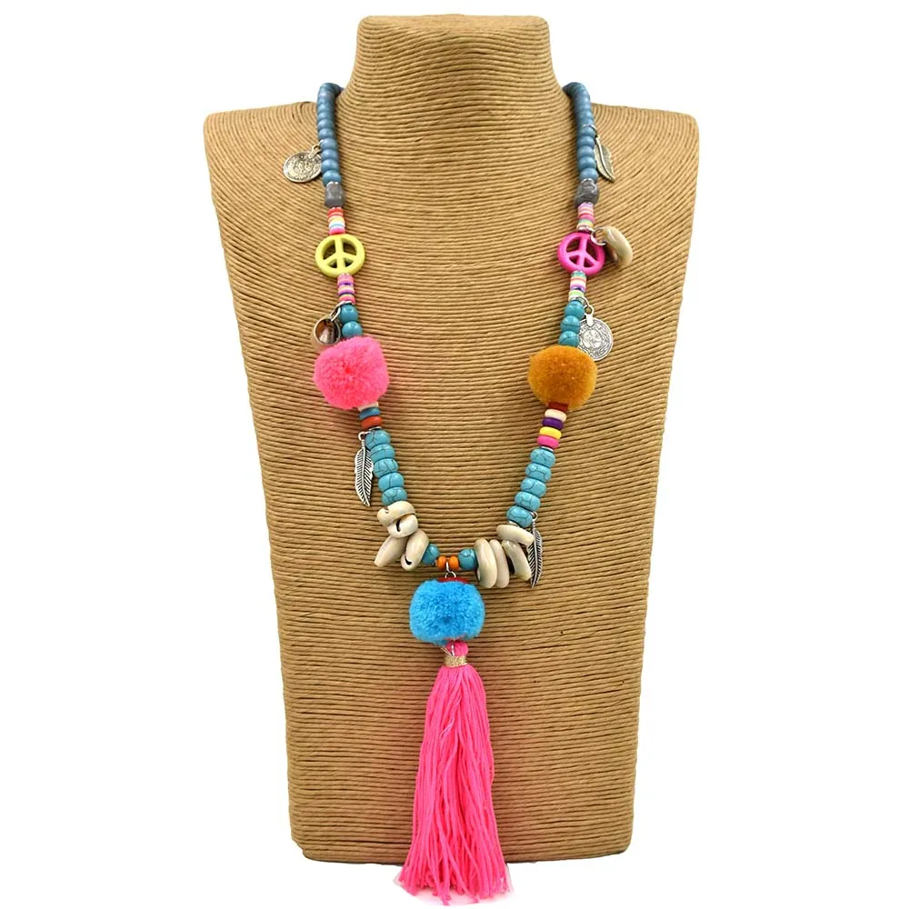 Новое Розовое Ожерелье с кисточками и помпонами, богемное длинное массивное ожерелье с бахромой и деревянными бусинами, колье макси