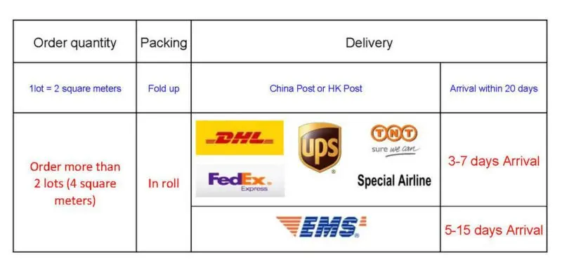 Время выполнения заказаМы можем отправить в течение 7 дней.Самое длительное время выполнения заказа составляет не более 20 дней.Большой заказДля большого заказа, пожалуйста, обратите внимание и не стесняйтесь связаться с нами для получения скидки.Доставка