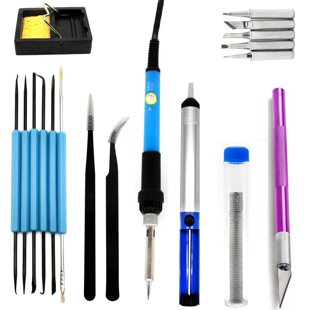 Полный комплект 8 в 1: этот комплект поставляется с паяльником, 6 наконечниками для припоя, 6 шт. паяльником, паяльником (насос для распайки), паяльной трубкой, антистатическим пинцетом, железная подставка и тканевая сумочка.