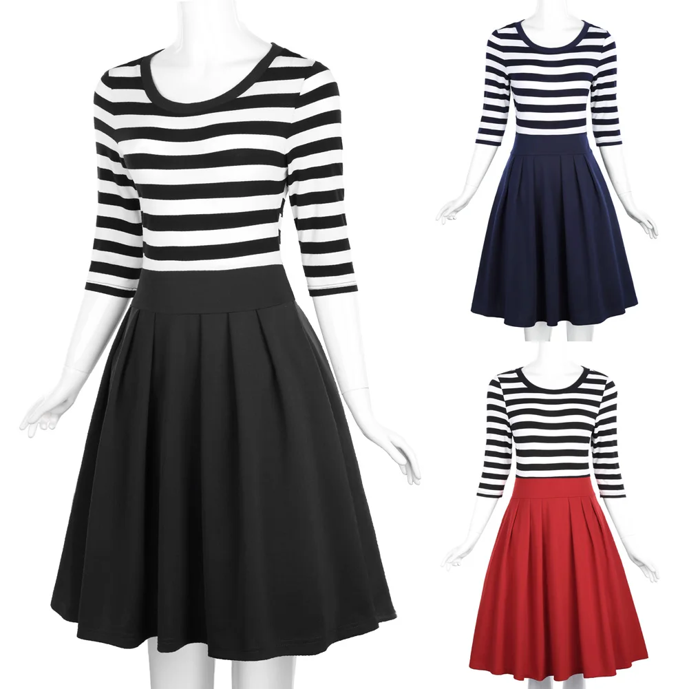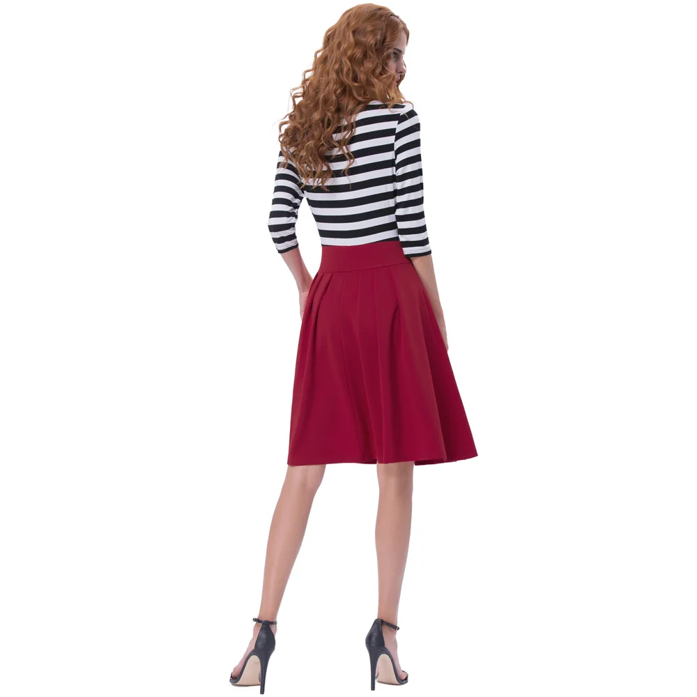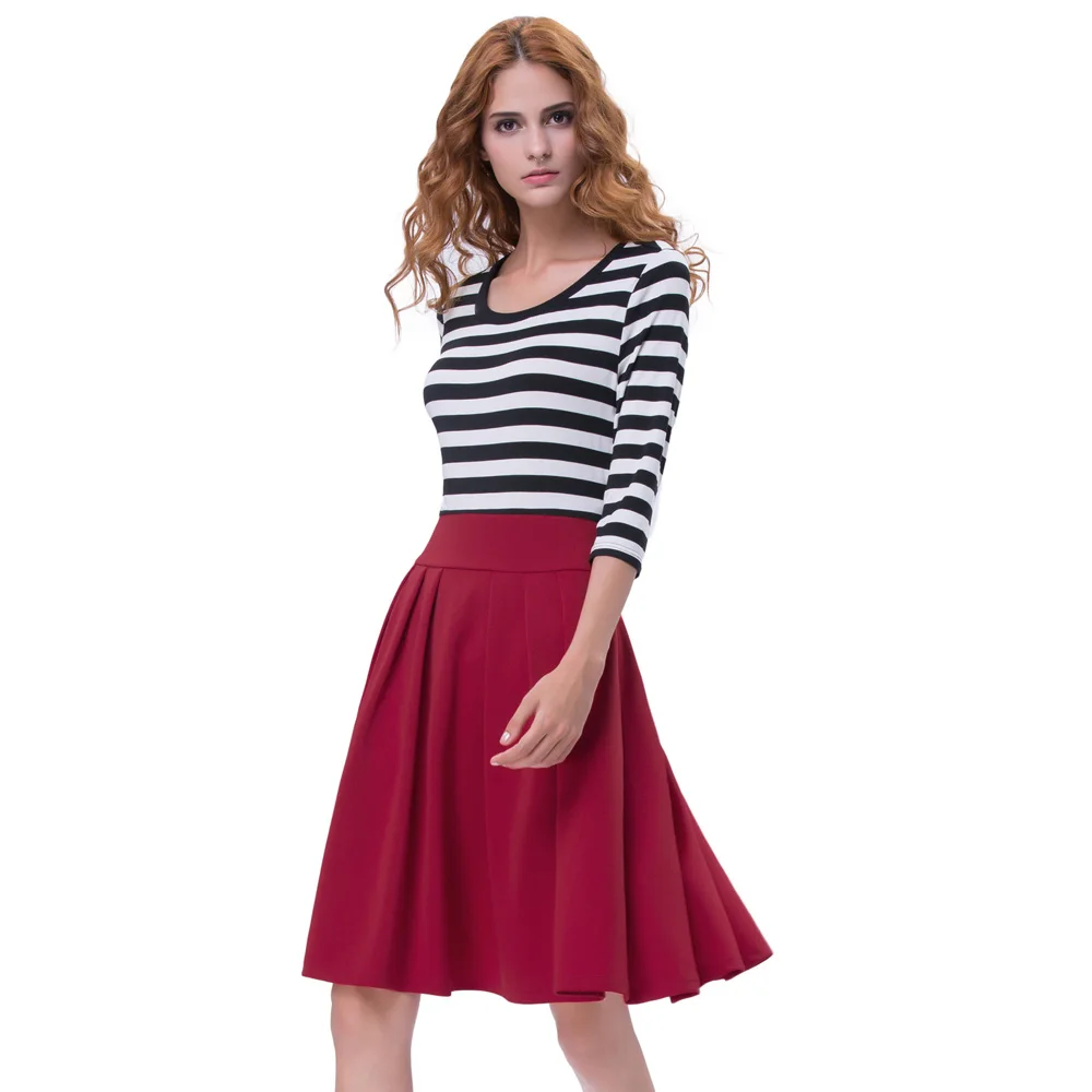 1) рукава длиной три четверти 2) вырез лодочкой 3) дизайн в морском стиле, узор в полоску 4) скрытая молния с левой стороны 5) верхняя часть хорошо эластичная, юбка немного эластичная 6) без подкладки |