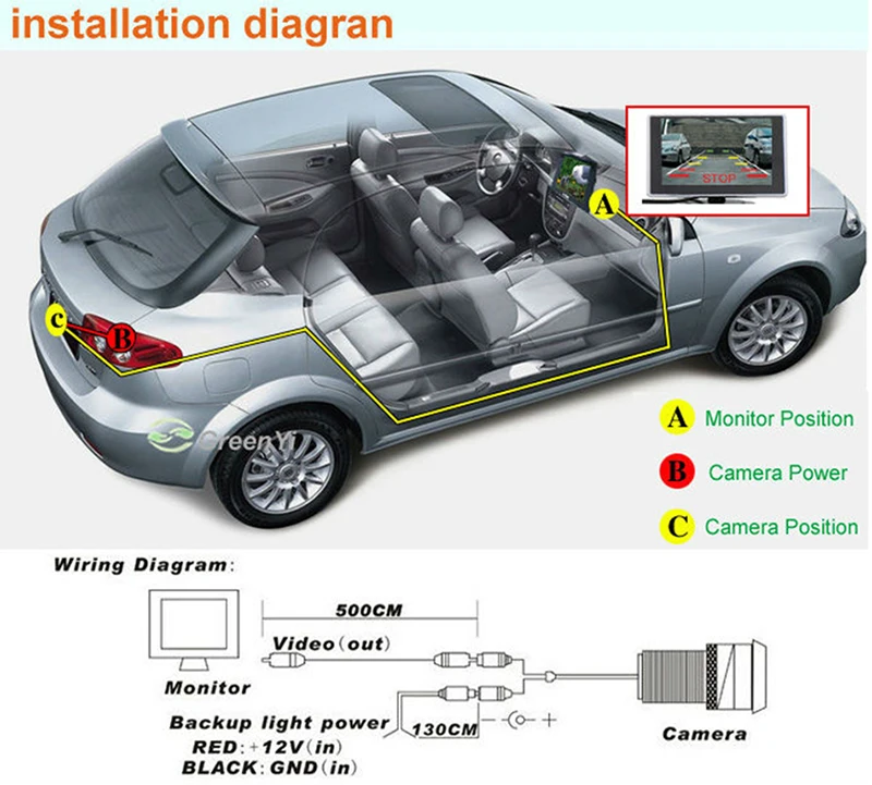 Подключите кабель питания камеры заднего вида с лампой заднего хода и подключите видео кабель камеры с белым кабелем ЖК-дисплея (видео V1), затем ЖК-дисплей покажет видео камеры, когда вы задним ходом, и прекратит воспроизведение фильма (автоматическое переключение)