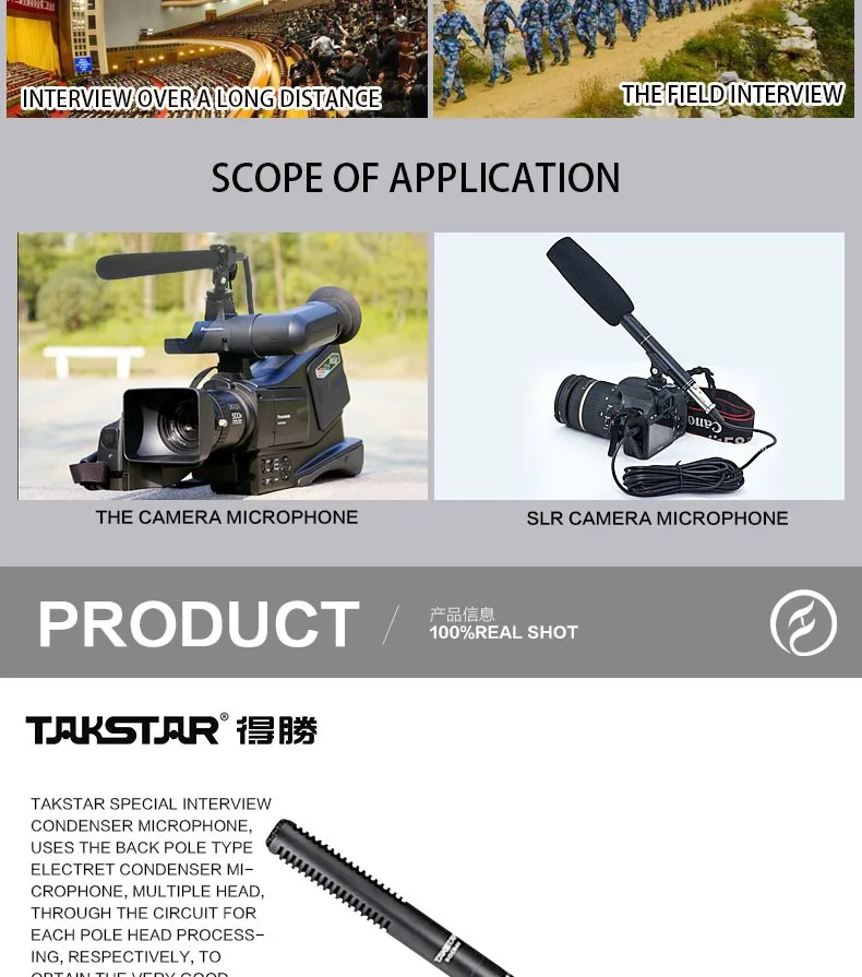 Особенности:Takstar Профессиональный конденсатор интервью микрофон --- Используйте задний электретный конденсаторный конденсатор микрофон и мульти-полюсов.Улучшенная Кардиоидная направленность и супер Кардиоидная направленность от обработки полюсов.Может использоваться во многих случаях и обеспечивает супер чистый голос, прост в использовании и долговечен.Закалённая головка микрофона может воспринимать громкий и Ближний звук.Спецификация:Направленность: двухточечныйЧастота: 50 Гц-16 кГцЧувствительность: -45 дБ +-2 дБ (0 дБ = 1 В/Па при 1 кГц)0,8 tput сопротивление: 500?/1600?+-30% (при 1 кГц)Сопротивление нагрузки: >-1000?Мощность: 1,5 V AA батареяОдин размер: Ø22x278 мм