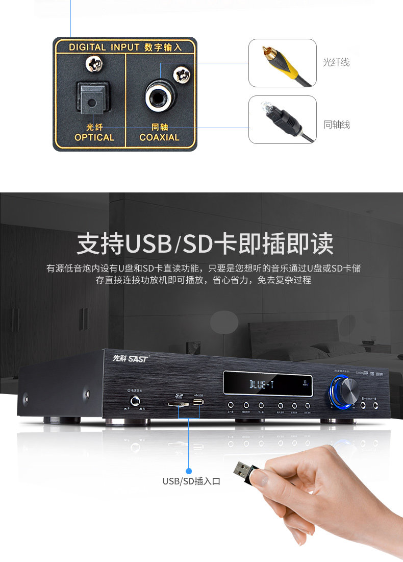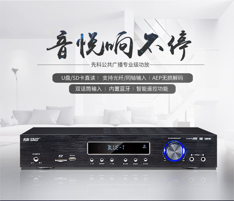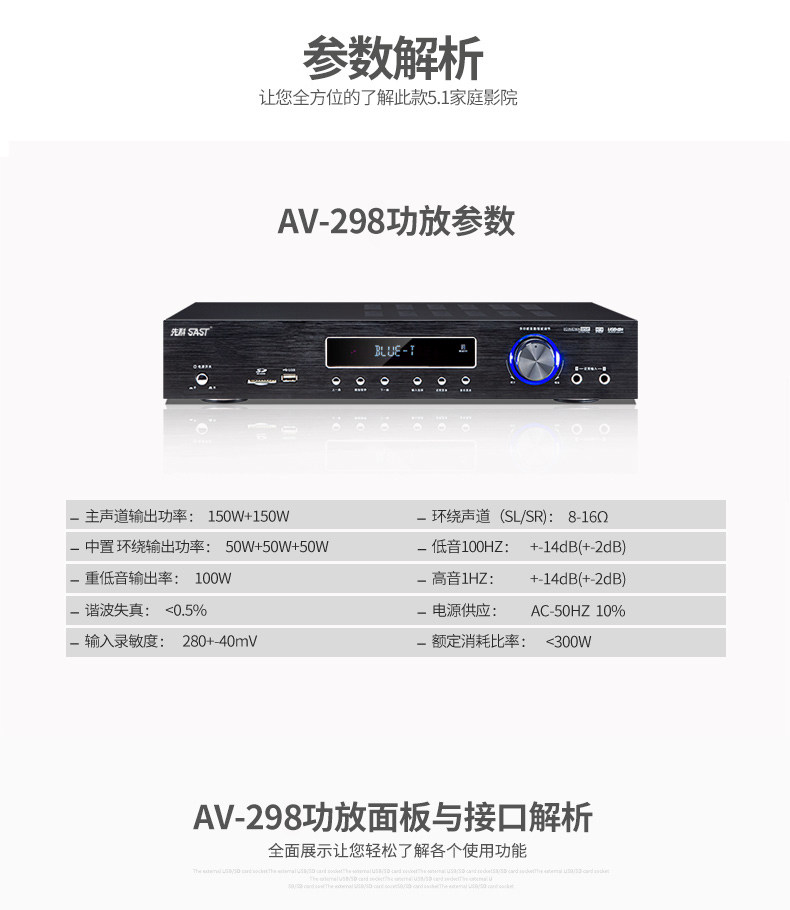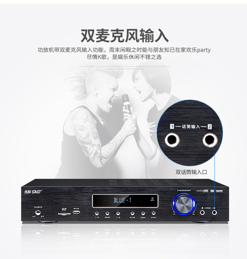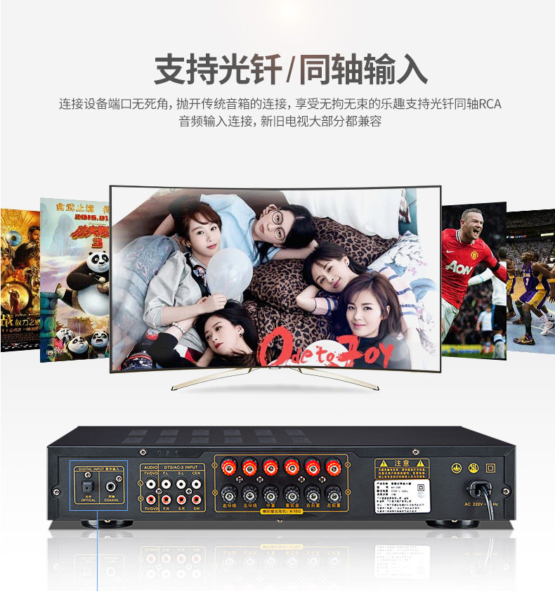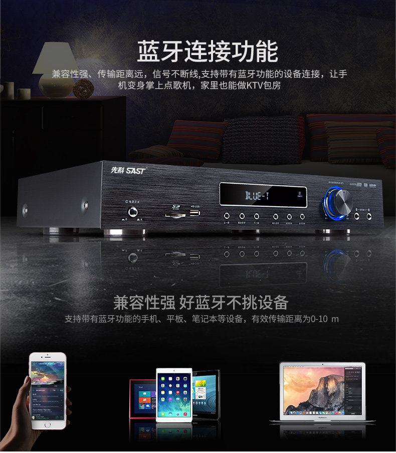 Канал: 5,1 Цвет: черный Особенности: Встроенный Bluetooth, дальность передачи 10 метров! Коаксиальный кабель, волокно вход Поддержка USB, sd-карты, воспроизведение! Поддерживает двойной вход для микрофона Поддержка декодирования без потерь APE!