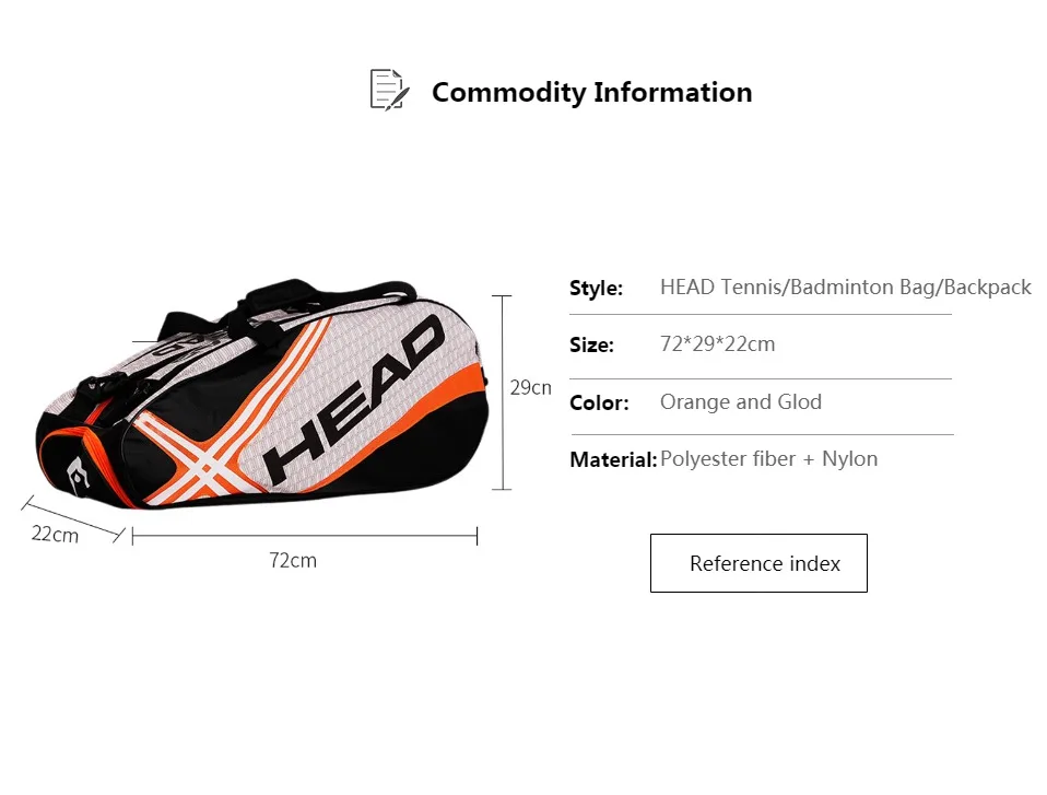 Вопрос: оригинальная головка? О: Да, мы продаем только оригинальные теннисные сумки. Вопрос: какой размер? A: Размер 73 см * 23*30 см (Д * Ш * В) Вопрос: Сколько ракеток вмещает? A: может вместить 4 шт. теннисных ракеток или 9 шт. ракеток для бадминтона. (Кроме ракеток, можно также положить полотенца, одежду, обувь и воду В: подходит для взрослых или детей A: для взрослых