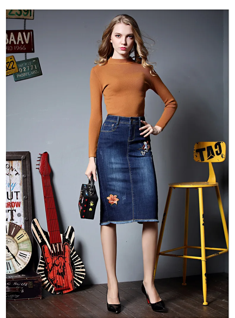 Джинсовые юбки с вышивкой, сексуальная узкая офисная юбка, стрейчевая юбка-карандаш, миди, для женщин, плюс размер, рваные джинсы, юбка, Faldas Mujer