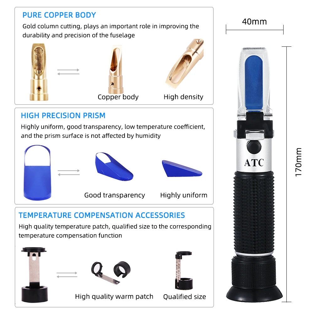 Эта модель разработана специально для измерения концентрации воды в меде. Этот тип рефрактометра имеет автономный калибровочный винт. Это обеспечивает удобство калибровки. Не требуется отвертка при калибровке. И квадратный дом призмы может сделать рефрактометр стабильным. Мы называем это n-style