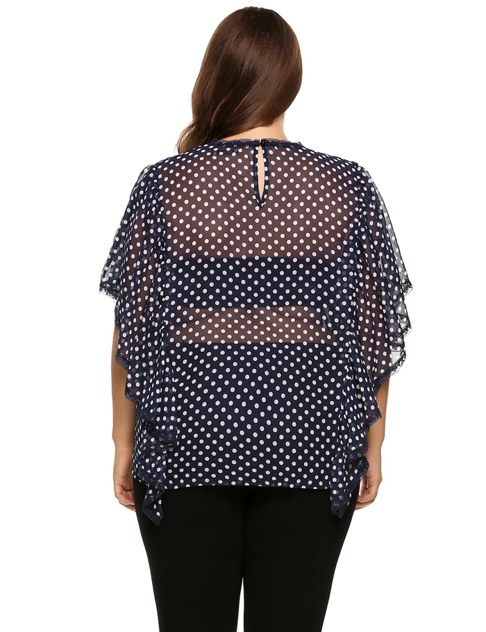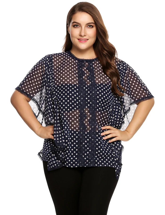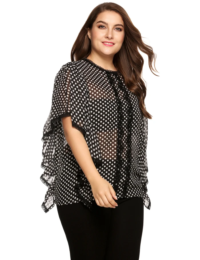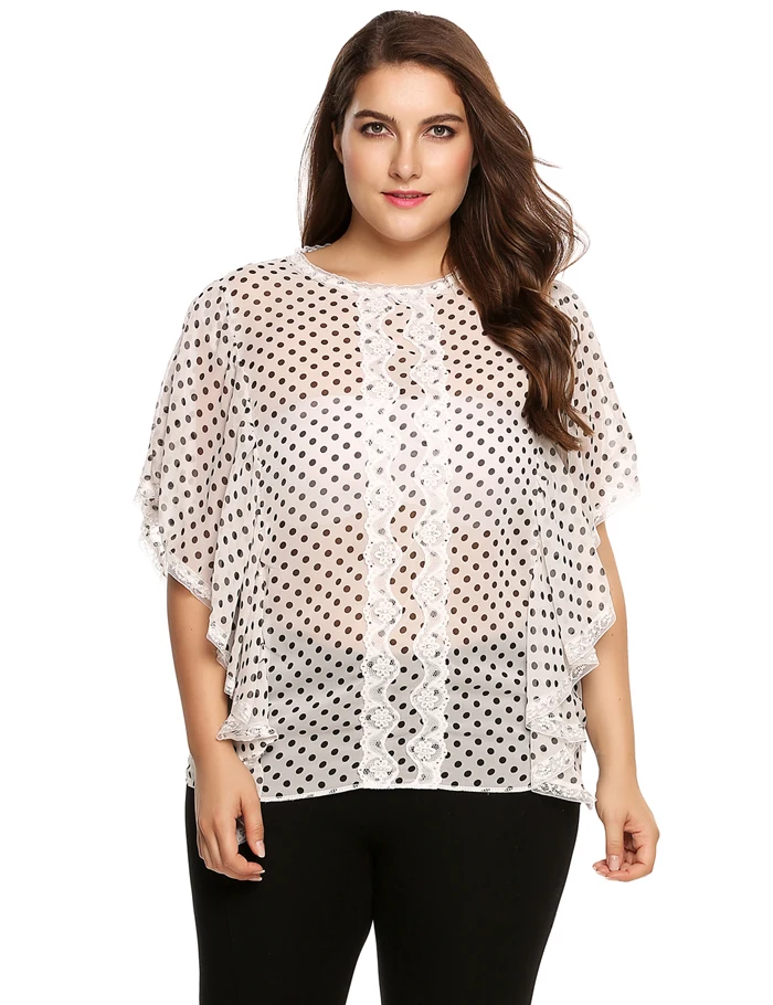 [Стиль] : IN'VOLAND женская блузка летняя мода размера плюс свободные с рукавами «летучая мышь» с коротким рукавом кружевная отделка шифоновая блузка в горошек с blause негабаритных 4XL