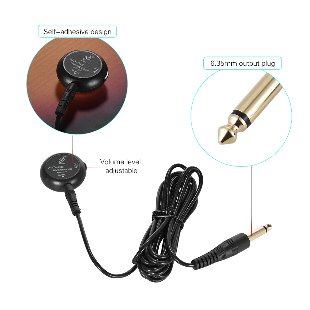 Преобразователь AD-35-это мини-преобразователь для акустической гитары, скрипки, укулеле и других резонансных коробок-вокальных музыкальных инструментов, что делает ваш инструмент производящим чистый, теплый звук с отличным резонансом.