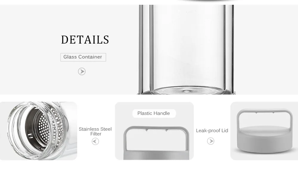 Бутылка для воды имеет превосходный стеклянный материал, который не выщелачивает любые вредные химические вещества в ваш напиток, или оставляет за собой какие-либо странные запахи или ароматы. Он предлагает пищевой фильтр из нержавеющей стали, прочный, но практичный. Он также имеет полностью герметичную пластиковую крышку с ручкой, вы можете выключить ее, встряхнуть и свернуть, как вам нравится.