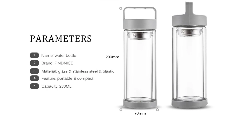 Эта инновационная стеклянная бутылка с двойными стенками имеет слой толстого стекла внутри и слой стекла снаружи, обеспечивая двойную защиту, гладкий и элегантный. Объем бутылки до 280 мл, удерживая достаточно воды, чтобы утолить жажду, но не слишком большой, чтобы разместить или хранить. В бутылке есть фильтр из нержавеющей стали, который позволяет наслаждаться вкусным чаем, не беспокоясь об остатке.