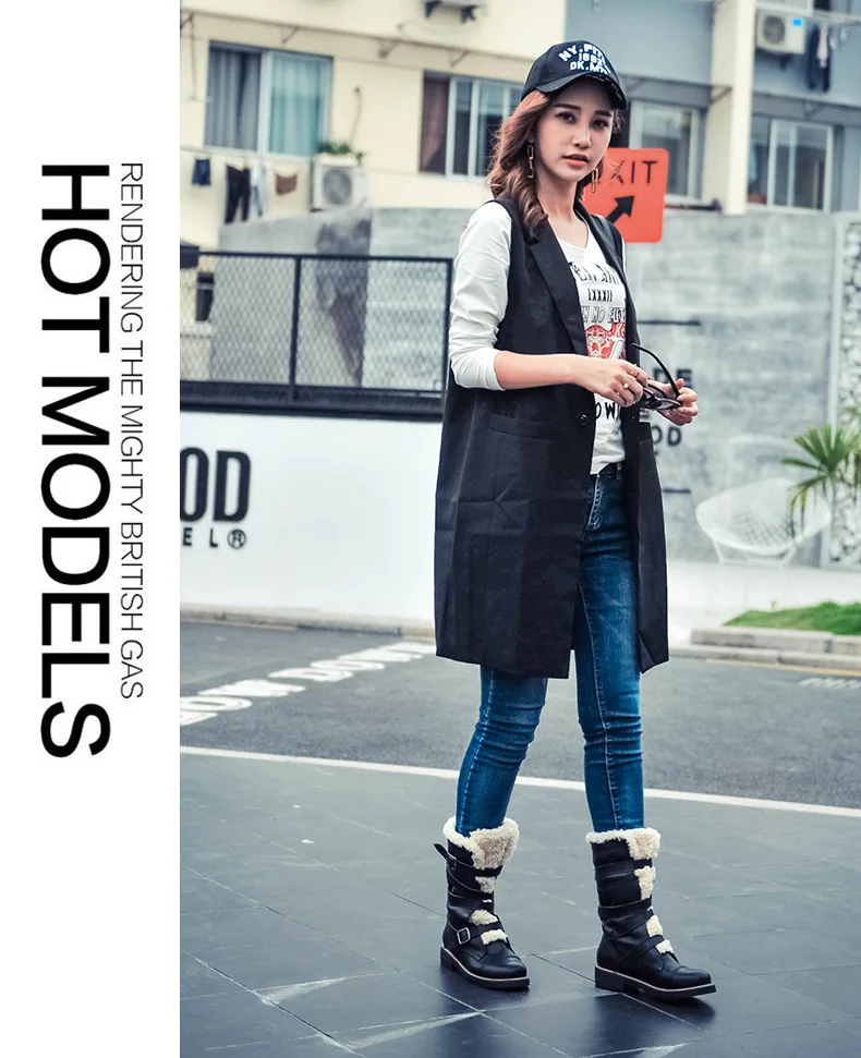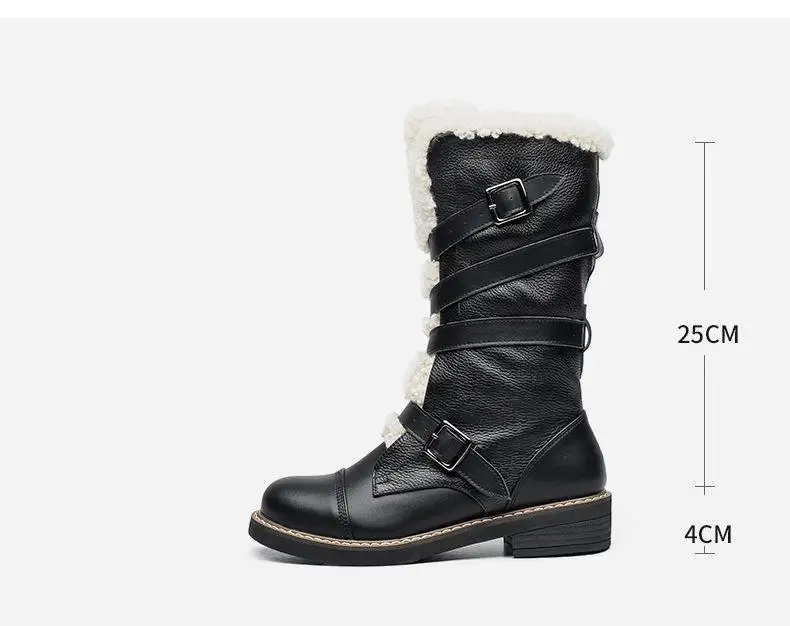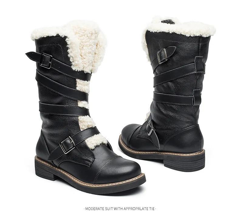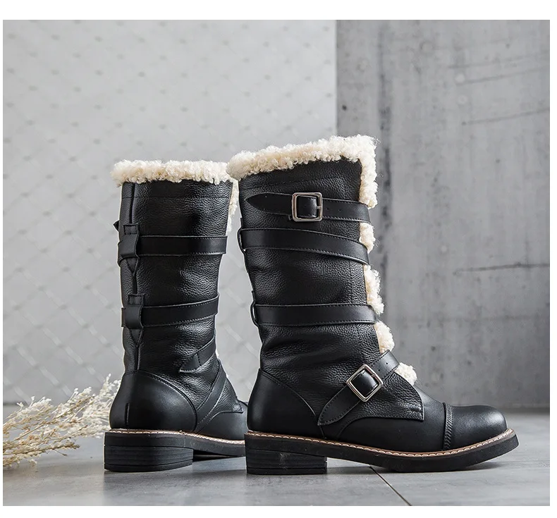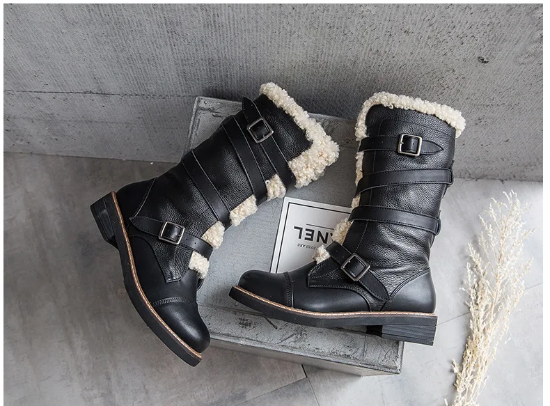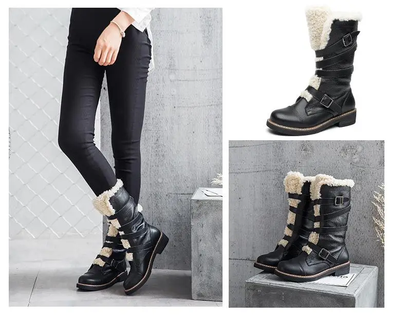 Для женщин зимние ботинки 2017, женская обувь натуральная кожа круглый носок квадратный каблук Туфли с ремешком и пряжкой женщины черные ботинки до середины икры adriamala