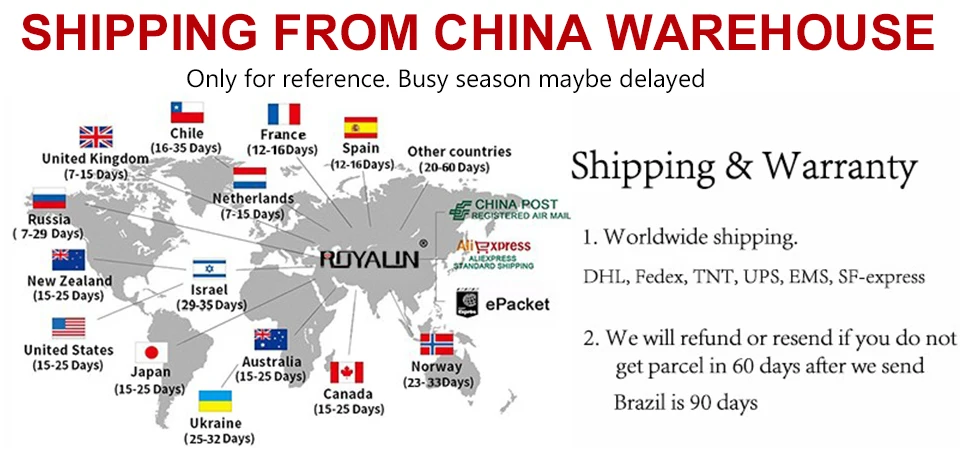 1. ROYALIN отправляет все товары по всему миру множеством способов доставки: Aliexpress доставка, Почта Китая, DHL, Fedex, UPS, EMS... 2. 60 дней гарантии доставки для большинства стран, Бразилия 90 дней гарантии. Мы вернем деньги, если вы не получите наши посылки вовремя.