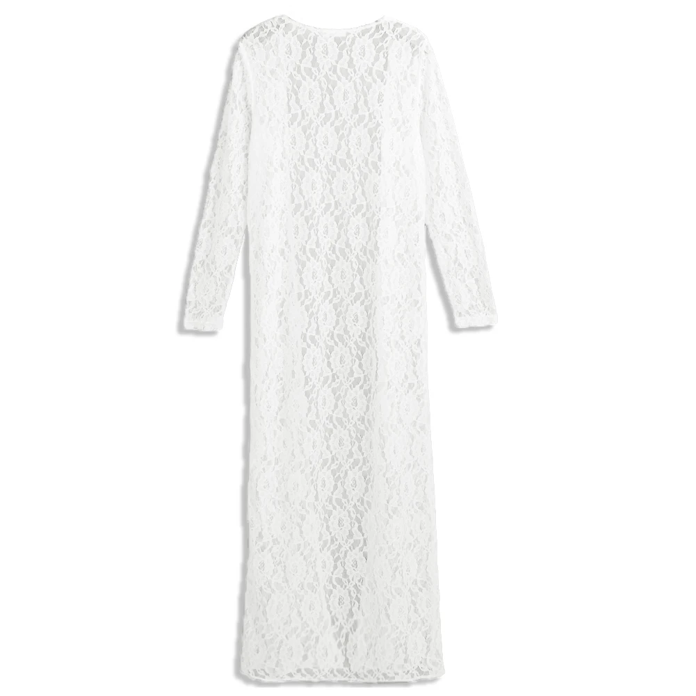 Это длинное кимоно, изготовленное из мягкой прозрачной кружевной ткани, отполировано цветочным узором, придающим гламурный вид.