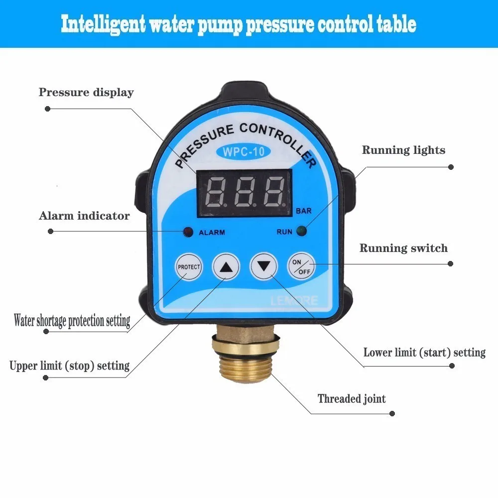 220V,10A; Насос с использованием геотермальной энергии (≤ 1.5KW)Может быть запущен непосредственноХарактеристики продукта:Экологичность: бесшумный дизайнБезопасность: IP65, водонепроницаемый чехол, защита от нехватки водыУмный: Предотвращение автоматического перезапуска насосаНадежный: электронный дизайн, с длительным сроком службы для использования, больше, чем 200000 раз Операционная, Антивибрационная конструкцияШирокое применение: Трубопроводный насос, Бустерный Насос, самовсасывающий насос, погружаемый насос, циркуляционный насос и т. Д. Широко используется для солнечного теплового насоса, теплового насоса с источником воздуха, домашнего бустерного насоса WILO, циркуляционного насоса для горячей воды Grundfos и других соответствующих насосов.Описание использования:Подача воды сверху внизКлапан сброса давленияПоложение устройстваВысотаСамый низкий выход водыВерхнее значение = Макс. Давление насоса-0,5 кгМеньшее значение = 0,5 кгЗащита нехватка воды значение = 0,2 кгВода снизу вверх:Самый высокий выход водыВерхнее значение = Макс. Давление насоса-0,5 кгМеньшее значение = H * 0,1 кг + 0,5 кгЗащита от нехватки воды ≤H * 0,1 кг Насос с автоматическим управлениемПоложение устройстваВысотаСамый высокий выход водыРасположение поверхности водыВерхнее значение = (максимальное давление насоса-ч) * 0,1 кг-0,5 кгМеньшее значение = H1 * 0,1 кг + 0,5 кгЗащита от нехватки воды ≤ H1 * 0,1 кг Задний кодКодЗначениеКак использоватьH2.9Верхнее значение, остановка 2,9 кгВы можете установить его в качестве инструкцииL1.5С более низкой стоимостью, стоп-сигнал 1,5 кгВы можете установить его в качестве инструкцииF0.2Защита нехватка воды 0,2 кгВы можете установить его в качестве инструкцииE-FЗащита от нехватки водыНажмите ON/OFF для перезапуска или ожидания перезапуска автоматическиE-HОшибка, диапазон давления или датчик поврежденПроверьте источник давления ПроводкаПожалуйста, посмотрите на заднюю часть WPC-10 контроля давления, слева-китайское слово «мощность», вы можете поставить 220 В переменного тока, справа-китайское слово «Мотор», подключите его к терминалу питания насоса 220Vac.