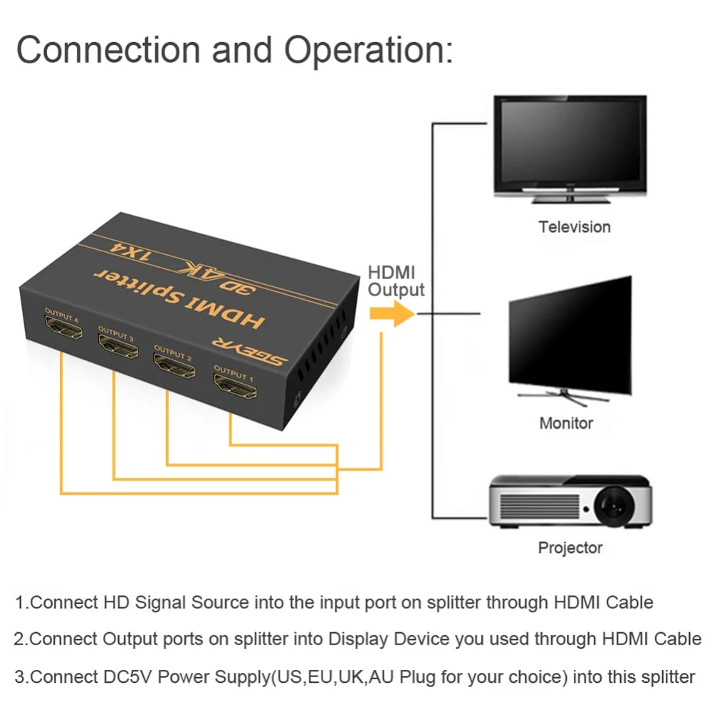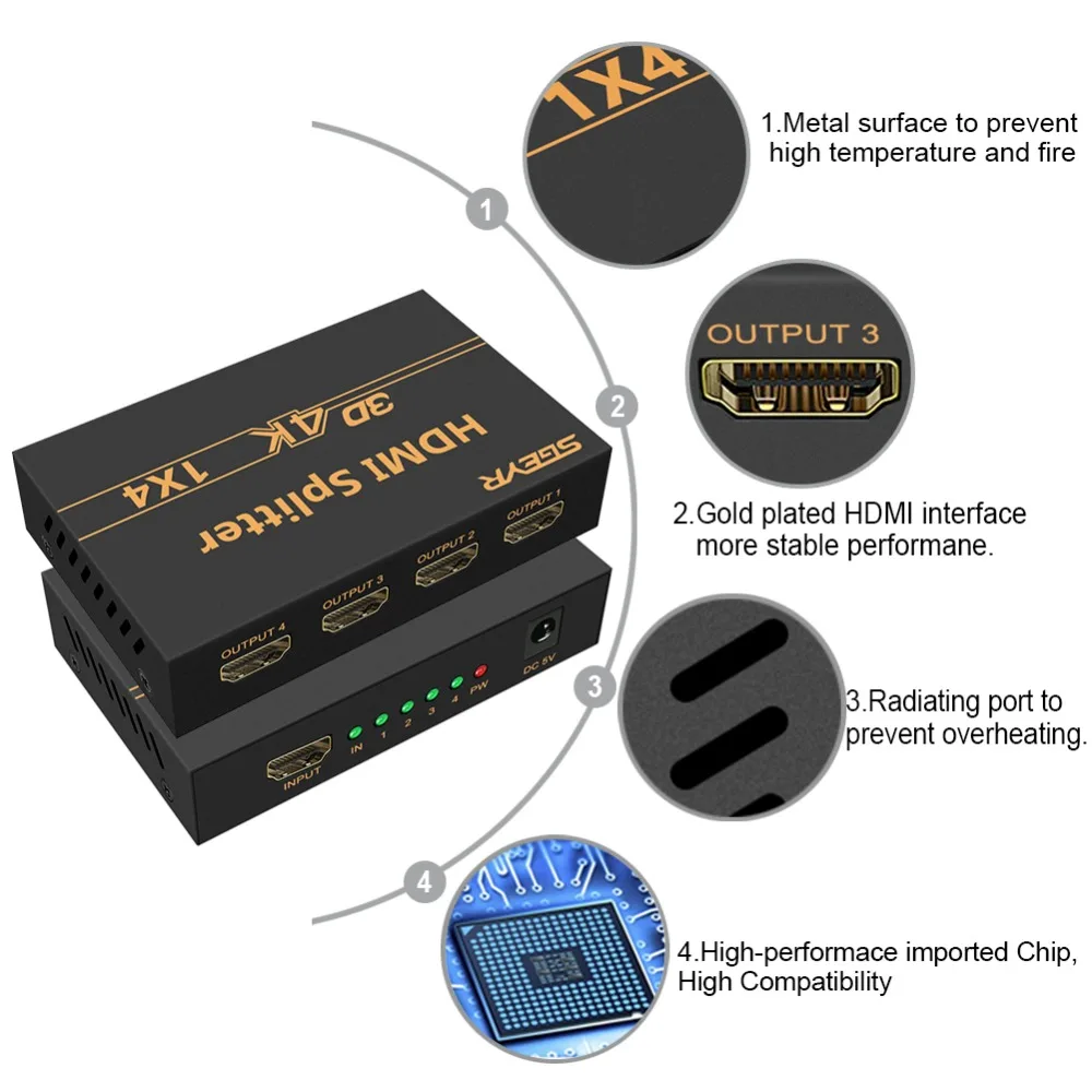 4 выхода 4K HDMI сплиттер ----- SGEYR 4 пути 4K x 2K HDMI сплиттер распределяет аудио и видео сигнал от одного источника до 4 различных HDMI дисплеев одновременно, И создавать впечатляющие презентации высокой четкости. Поддержка разрешения 4K x 2K Ultra HD ------ этот сплиттер 4K HDMI поддерживает большинство разрешения s, включая 4K x 2K @ 30hz, 1080P @ 60hz, 1080P @ 30 Гц, 3D /720P, вы можете наслаждаться HD реалистичной картинкой без потери качества. Добавление адаптера питания DC5V позволяет подключаться к источнику питания и более стабильной передаче сигнала HDMI. Поддержка глубокий Цвет ------ это 4 способа Разделитель с мультимедийным интерфейсом высокой четкости Поддержка s 30bit, 36bit Blu-Ray 24/50/60fs/XvYCc глубокий Цвет, делает HD ТВ Цвет дисплея Цвет более точный, более естественное и реалистичное. И поддерживает повторную синхронизацию сигнала. С функцией охлаждения ------ этот сплиттер HDMI 4K SGEYR с сверхмощным охлаждающим металлическим корпусом, он может защитить внутренние детали и не легко повредить. Кроме того, наш сплиттер HDMI имеет функцию охлаждения, которая сохраняет их прохладными и не нагревается после длительного использования, обеспечивая длительный срок службы. Подключи и играй ------ больше драйверов не требуется. Вам просто нужно правильно подключить его, и вы можете начать hd-видео и не потерять удовольствие от звука.