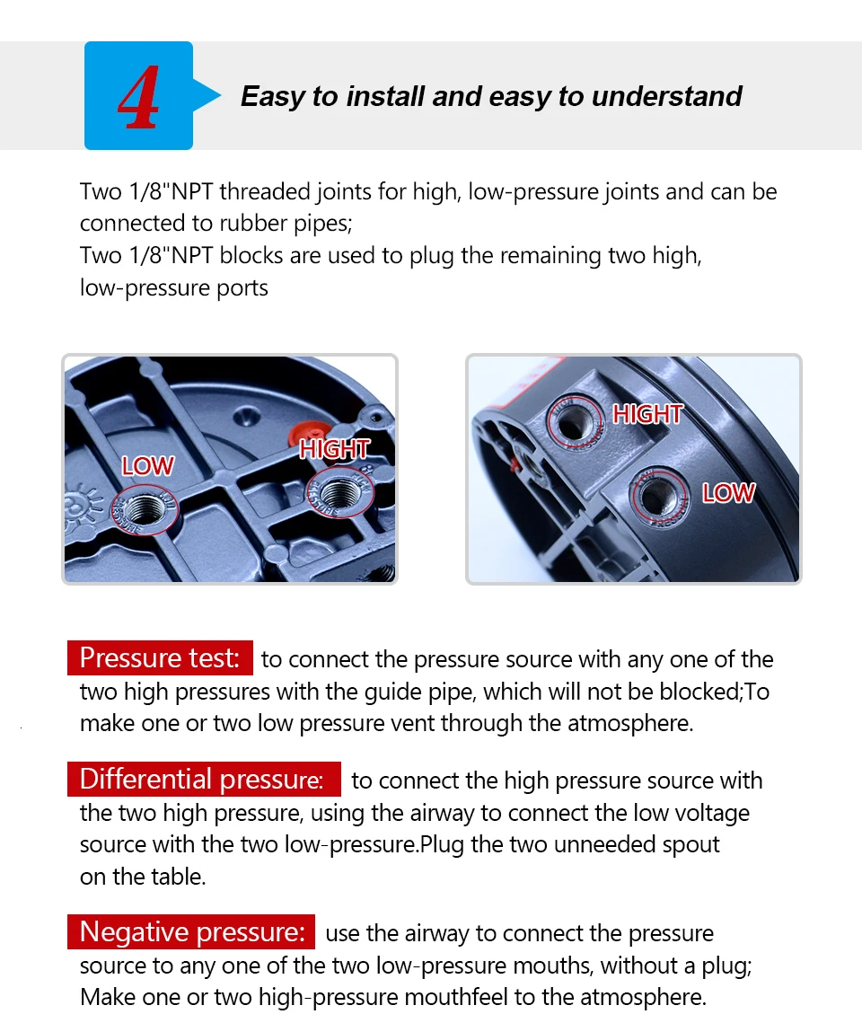 Перепада давления:Используйте газовое направляющее соединение для труб с источником высокого давления и в зависимости от того, какой порт высокого давления, используйте газовое направляющее соединение для труб с источником низкого давления и в зависимости от того, какой порт низкого давления, затем подключите другое, не используя порты.