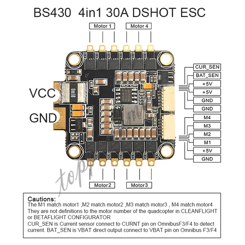 Беговая версия BS430 4in1 ESC 4x30A запускает новейшую прошивку BLHELI_S, поддерживает Dshot/Multishot/Oneshot42/Oneshot125, она предлагает лучшую производительность в 35x35 мм размере egrated. Датчик тока и напряжения Работает до 30A каждого двигателя. Спецификация: BB21 MCU, 48 МГц работает с прошивкой BLHELI_S J_H_xx Поддерживает 3-6S lipo вход 4PWM вход Con. Ток: 30A Пиковый ток: 35A (10S) Датчик тока и напряжения 5V 3A BEC Только 36x36 мм, крепежные отверстия 30,5x30,5 мм м3 Внешние конденсаторы не требуются Совместим с Omnibus F3 F4, легко монтируется с летучей башней Особенности: -BLHeli_S предназначен для превосходной производительности в гонках FPV и использует аппаратный сгенерированный двигатель pwm для плавного отклика дроссельной заслонки и бесшумной работы. -Код поддерживает обычный 1-2 мс импульсный вход шириной, а также Oneshot125 (125-250us), Oneshot42 (41,7-83.3us) и Multishot (5-25us) и D-shot. -Входной сигнал автоматически обнаруживается ESC при включении питания. -Все коды используют режим демпфированного светильник. Демпфированный светильник делает регенеративное торможение, вызывая очень быструю задержку двигателя, и по своей природе также делает активный фриволинг -Код поддерживает функции для предотвращения потери синхронизации. Есть настраиваемые параметры, которые могут хорошо работать с кодом даже в самых сложных ситуациях, хотя настройки по умолчанию будут работать -Превосходно работает в нормальных условиях -Код также поддерживает функцию маяка, где ESC начнет звуковой сигнал после заданного времени нулевой дроссельной заслонки. Это может быть очень полезно для поиска потерянных ремесел. Посылка включает: BS430 ESC x 1 Кабель x 2 Нейлоновые винты M3 x 4 M3 нейлоновая Колонка x8 Нейлоновая гайка M3 x 4