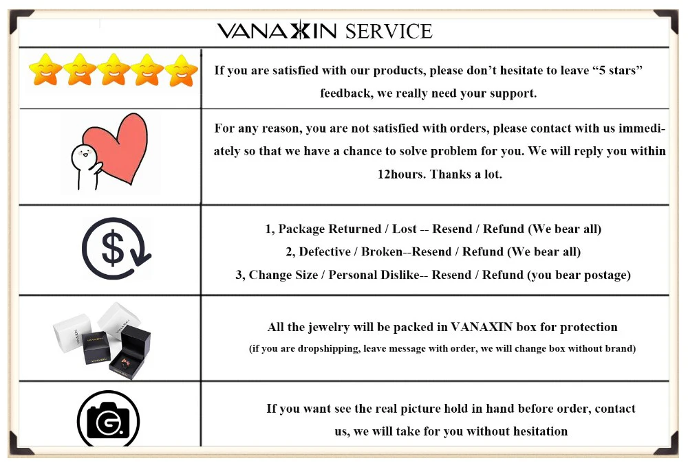Если по какой-либо причине вы не удовлетворены нашими ювелирными изделиями, нам очень жаль. Но не беспокойтесь об этом, вы можете связаться с нашим сервисом, мы всегда здесь, чтобы решить для вас.
