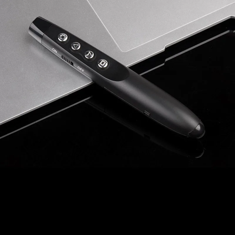 Удаленная лазерная указка имеет красный индикатор линии, красную кнопку, ключ страницы, ключ вниз, слайд-шоу, черный экран, гиперссылка, объем плюс, уменьшение громкости и функция отключения звука.