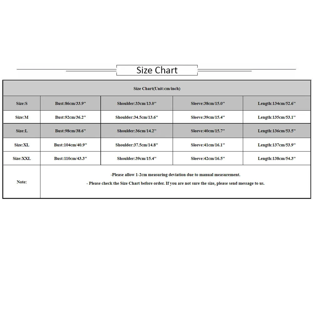 | Размер: XXL | Бюст: 110 см/43,3" | Плечо: 39 см/15,4 дюйма | Рукав: 42 см/16,5" | Длина: 138 см/54,3" |