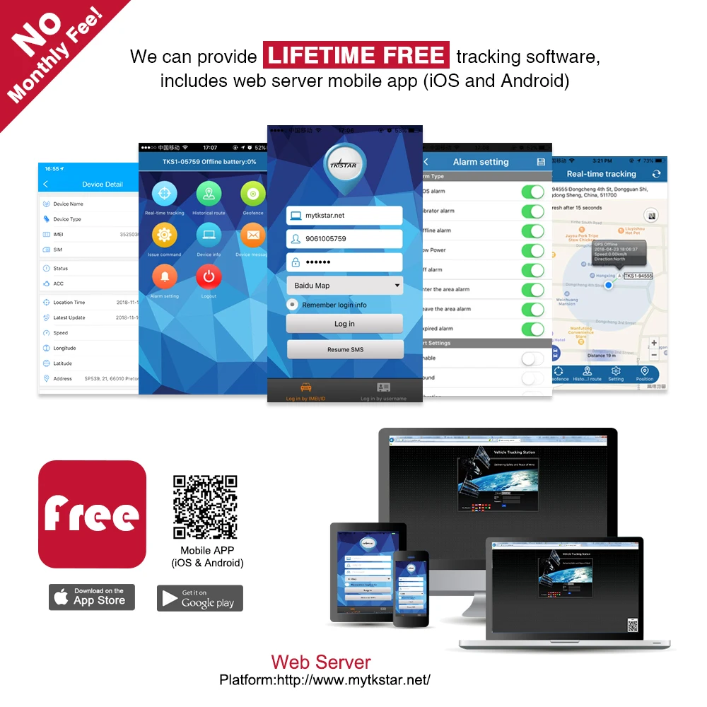 Веб-сайт: http://www.mytkstar.net/ Мобильное приложение: отсканируйте qr-код на изображении и загрузите мобильное приложение, Войдите в систему с идентификатором устройства (наклейкой выше устройства), номером и паролем; (оригинальный пароль: 123456. Вы можете изменить его).